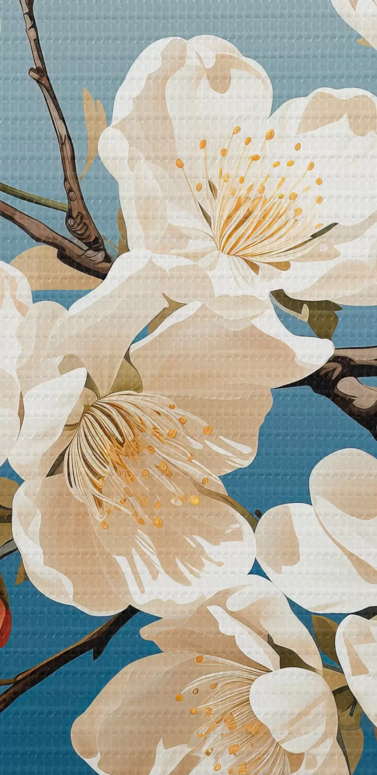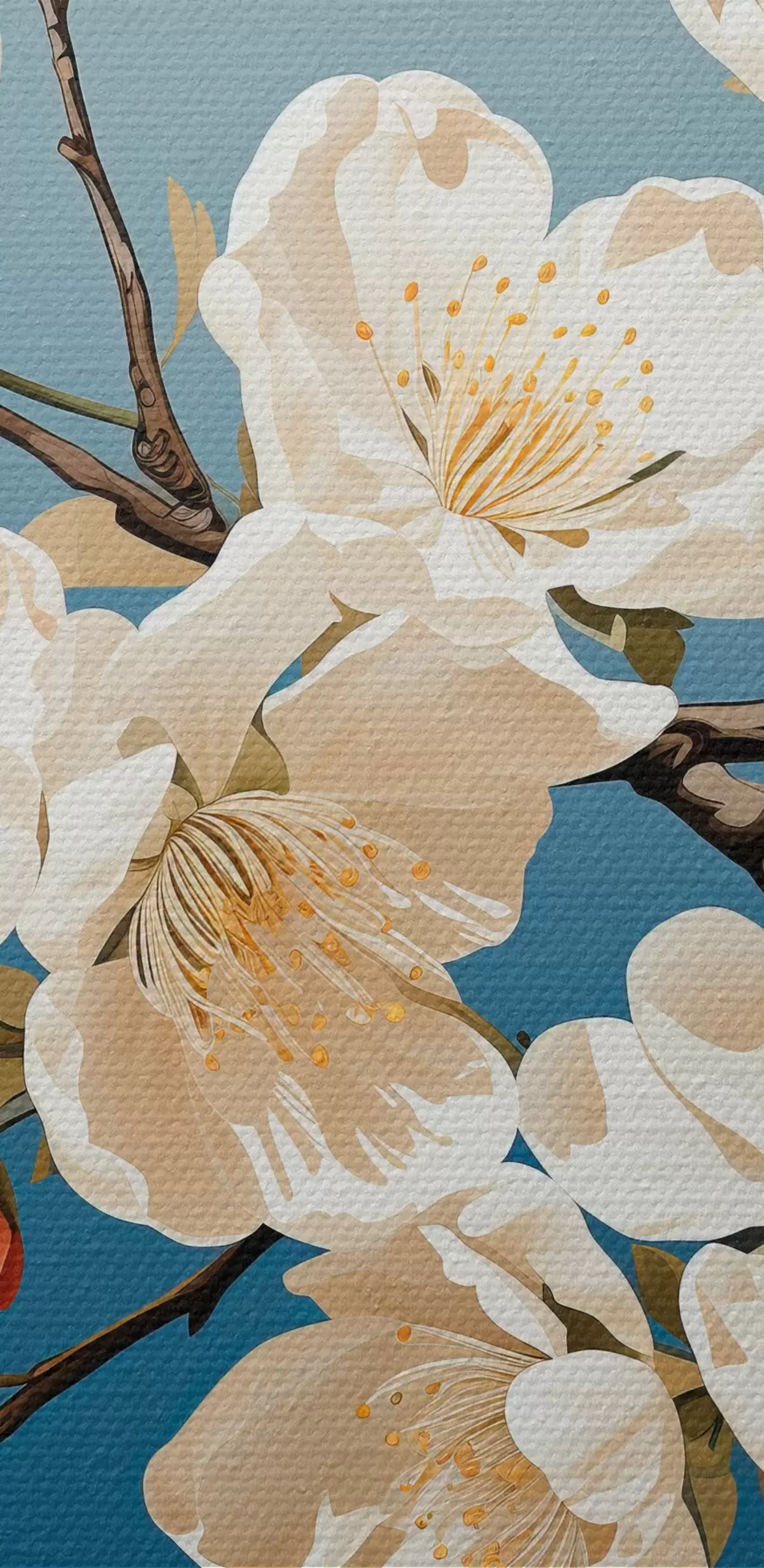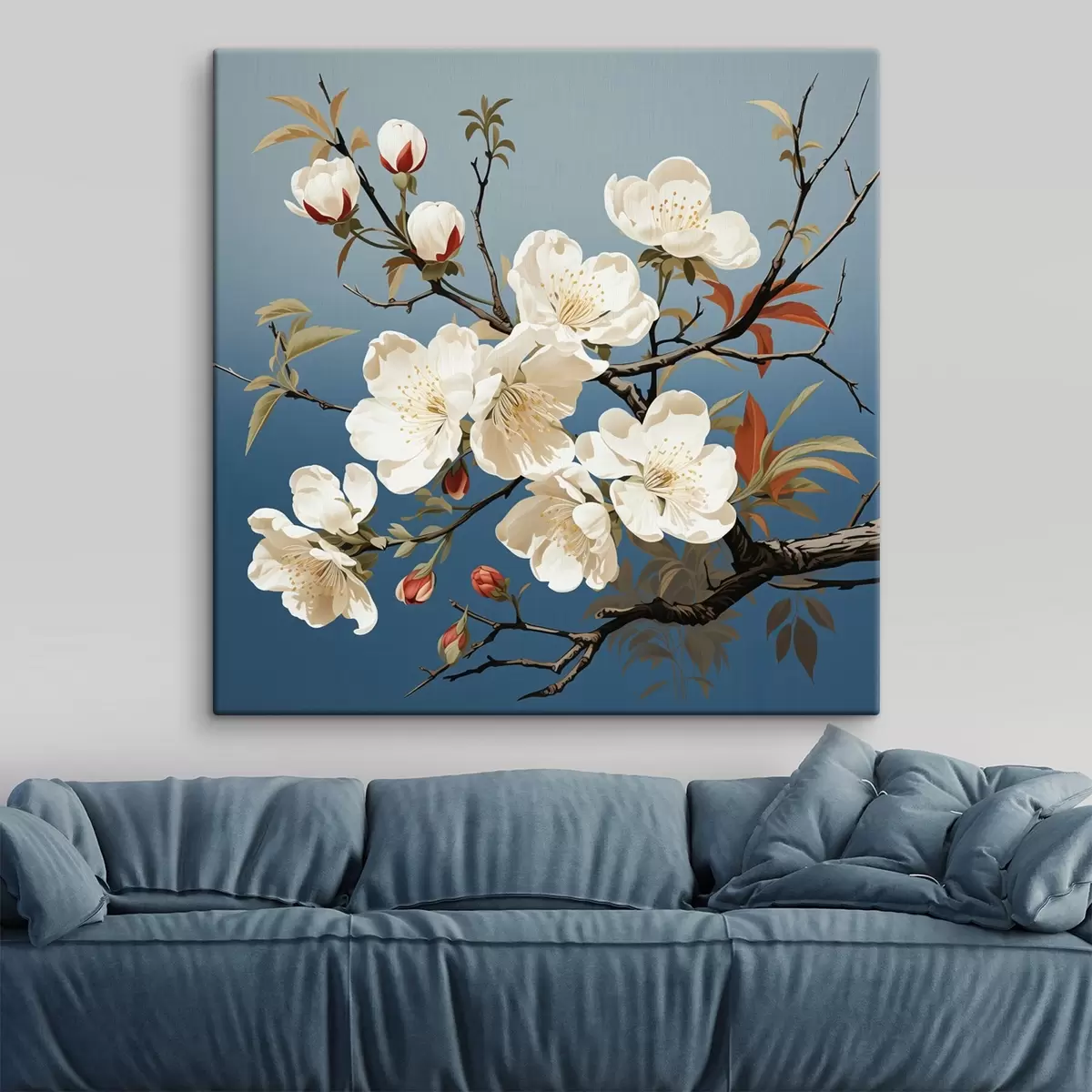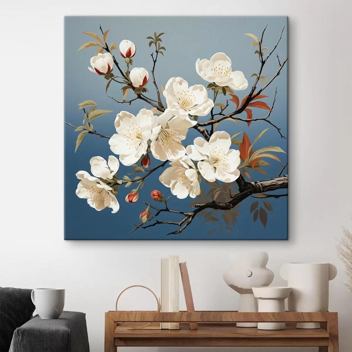 Tableau Branche de magnolia avec bourgeons rougeâtres sur fond bleu Nr s44341