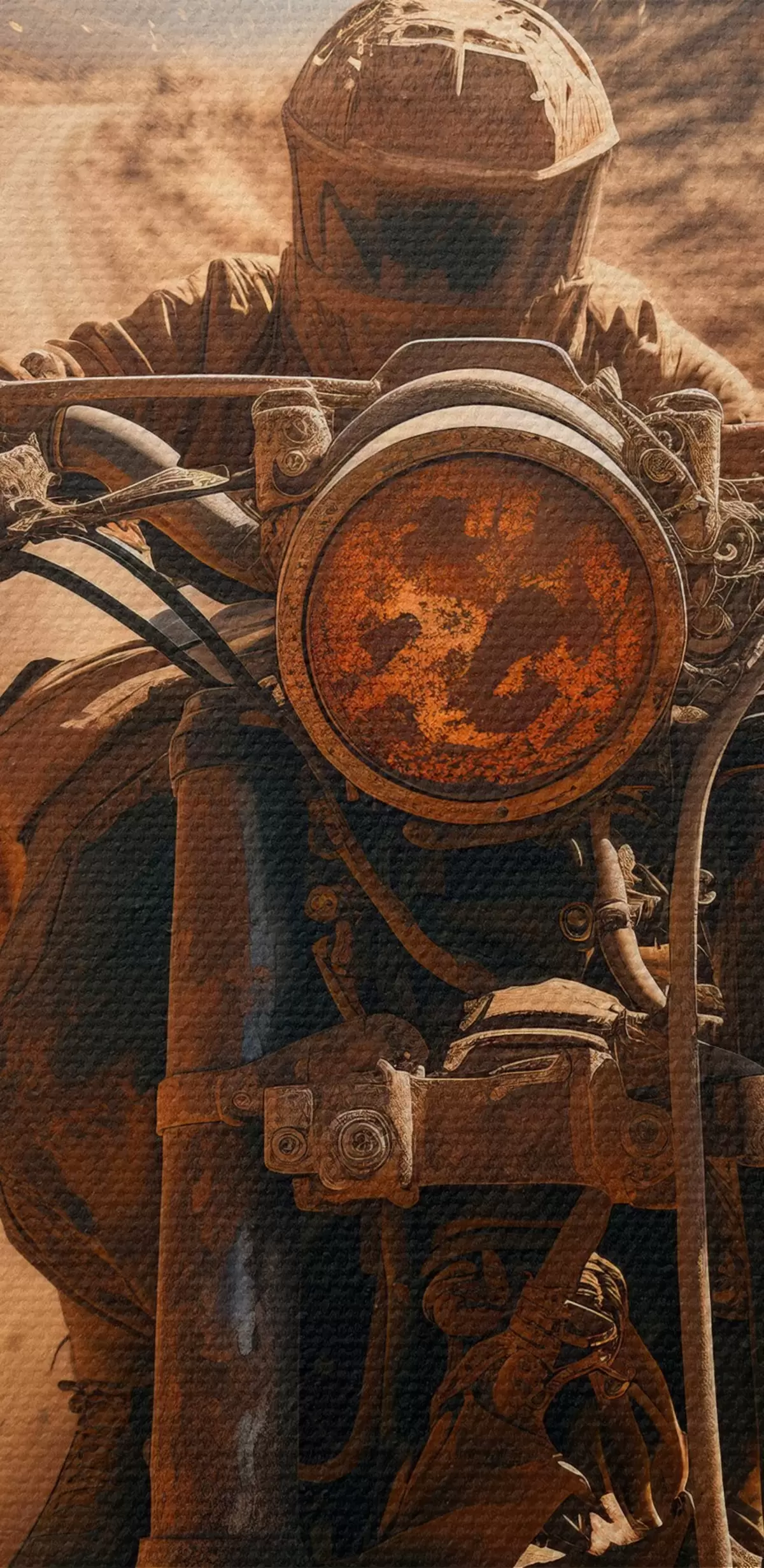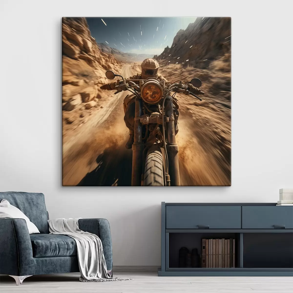 Tableau Motocycliste roulant à vive allure sur une route désertique Nr s44361