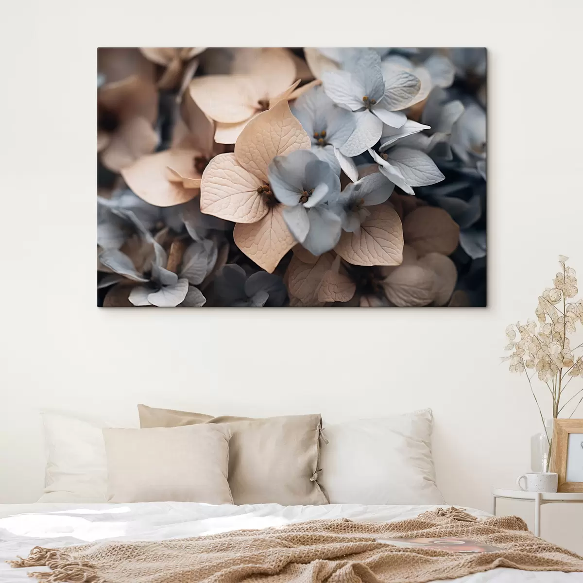 Tableau Fleurs d'hortensia, pétales bleu clair et beige, avec textures détaillées, arrangement floral élégant Nr s44394