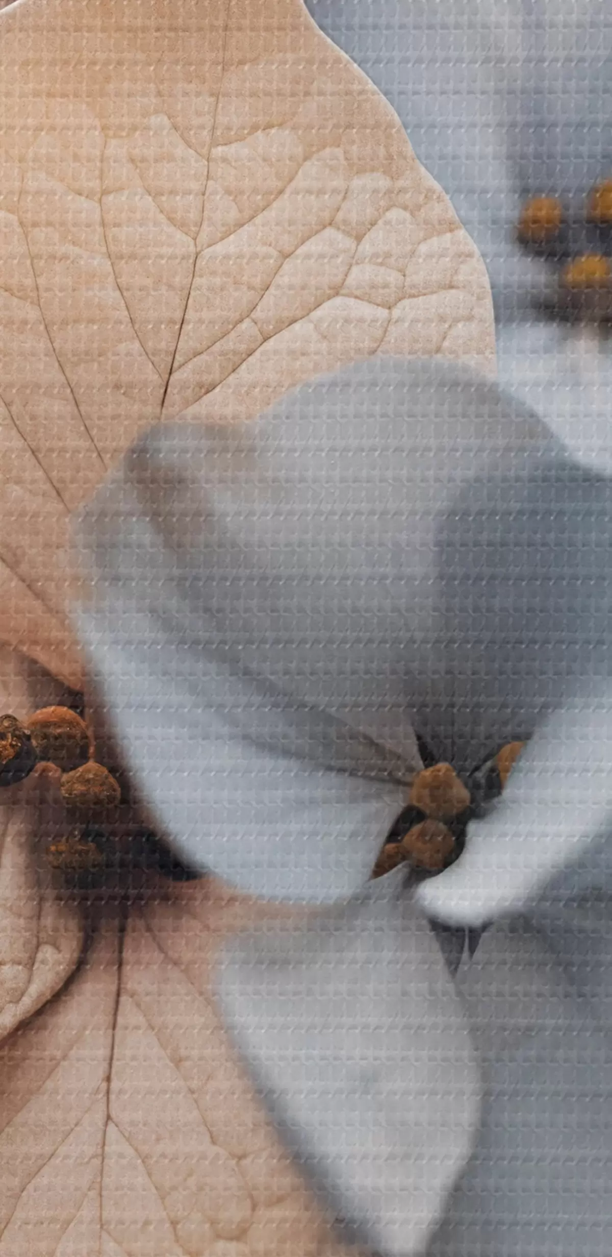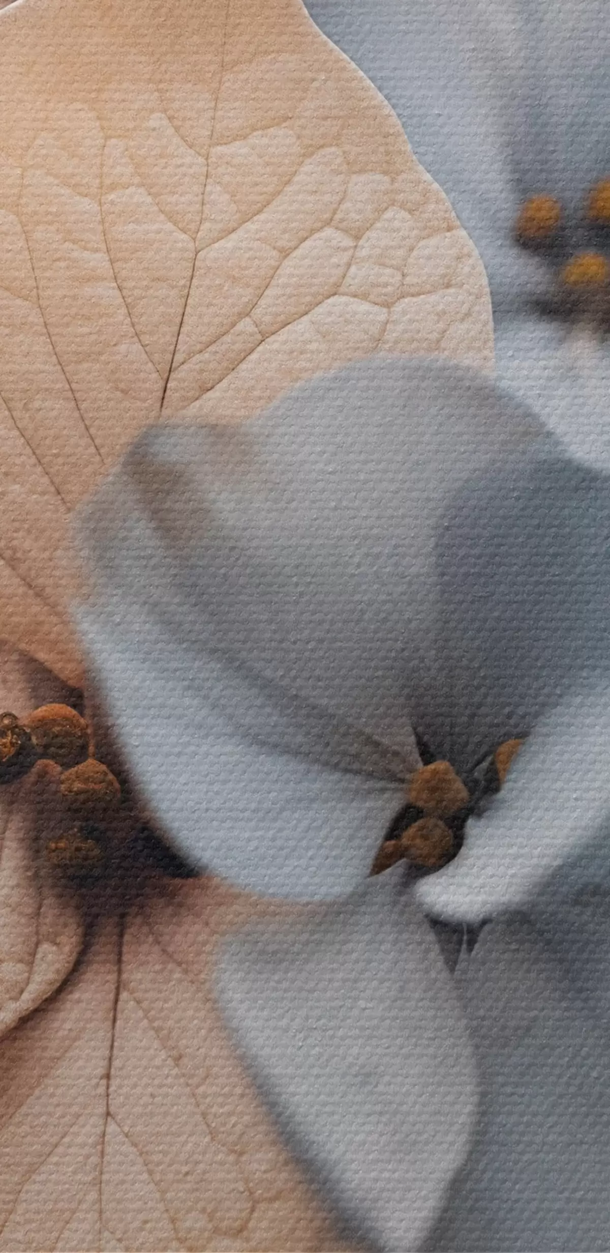 Tableau Fleurs d'hortensia, pétales bleu clair et beige, avec textures détaillées, arrangement floral élégant s44394