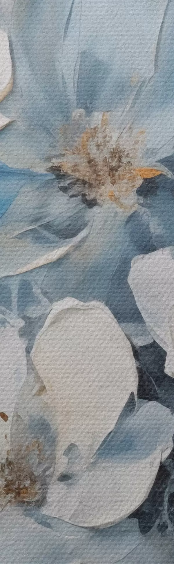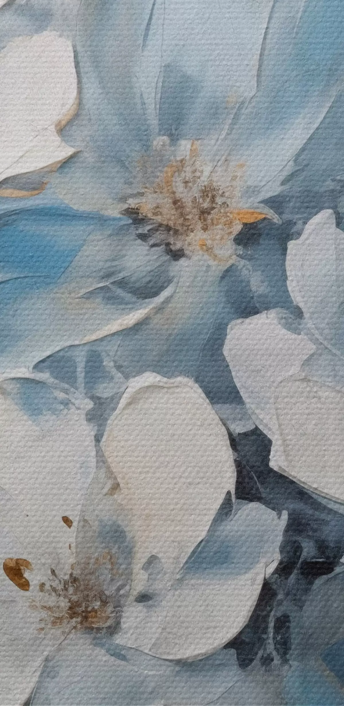 Tableau Fleurs blanches avec des feuilles bleues, sur un fond beige clair, avec des coups de pinceau visibles Nr s44395