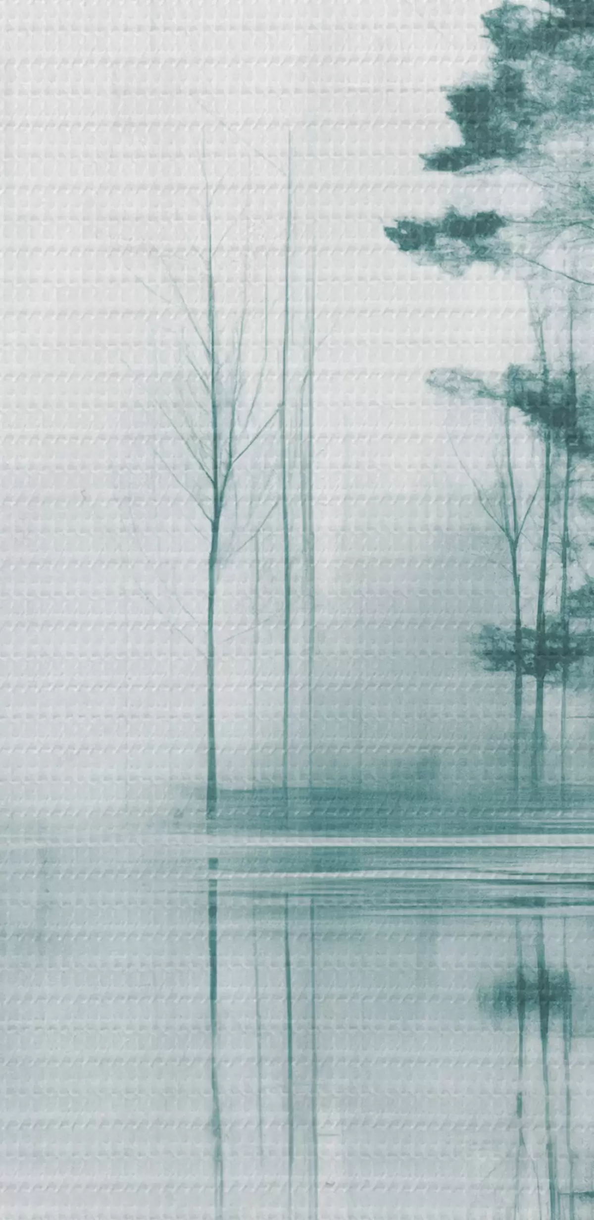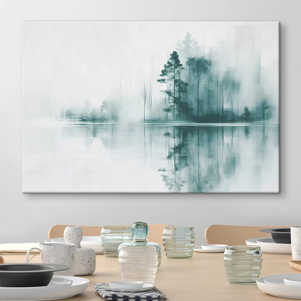 Tableau Forêt abstraite avec de grands arbres se reflétant dans l'eau, palette de couleurs sourdes s44403