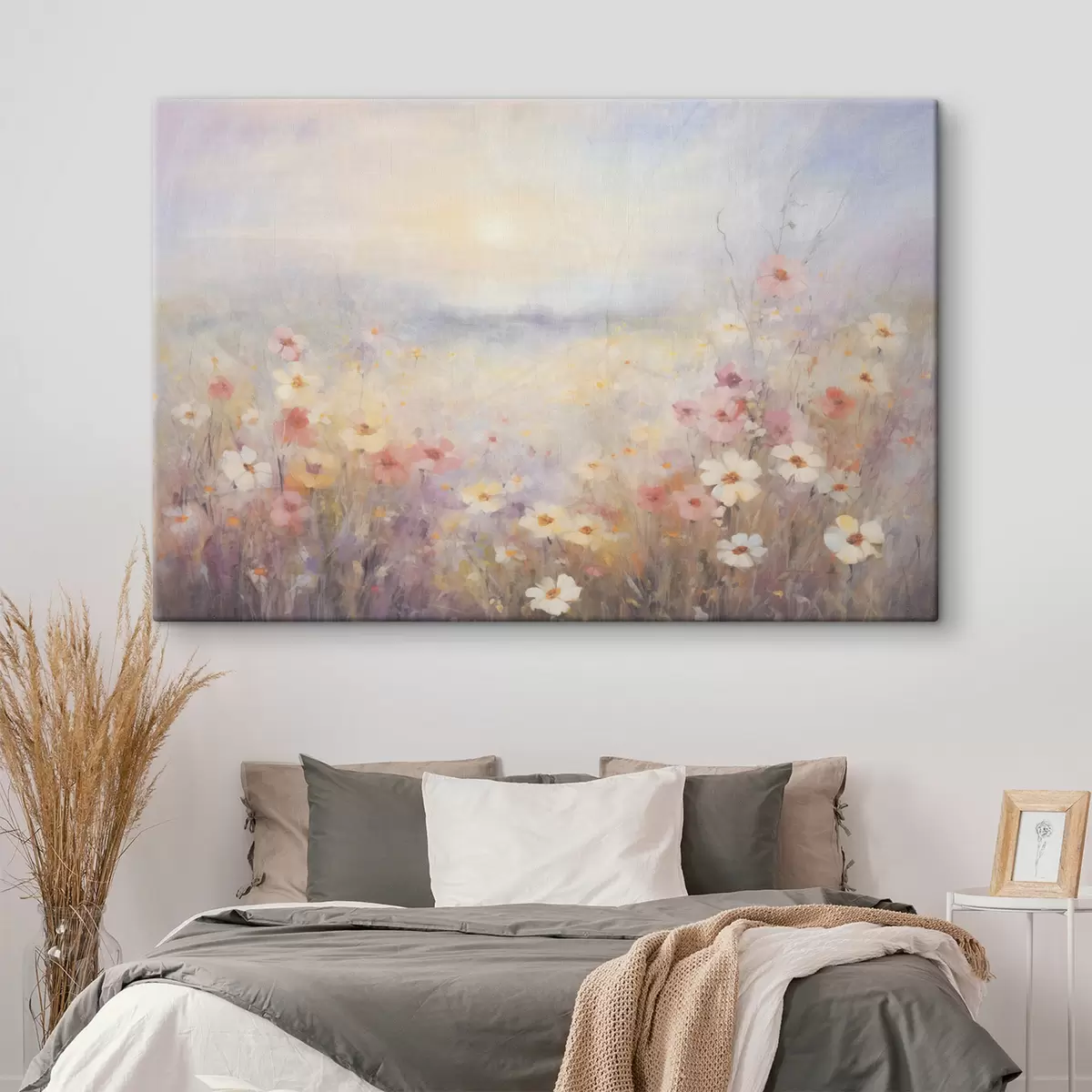 Tableau Paysage ensoleillé texturé d'un champ de fleurs, couleurs pastel douces, atmosphère rêveuse s44408