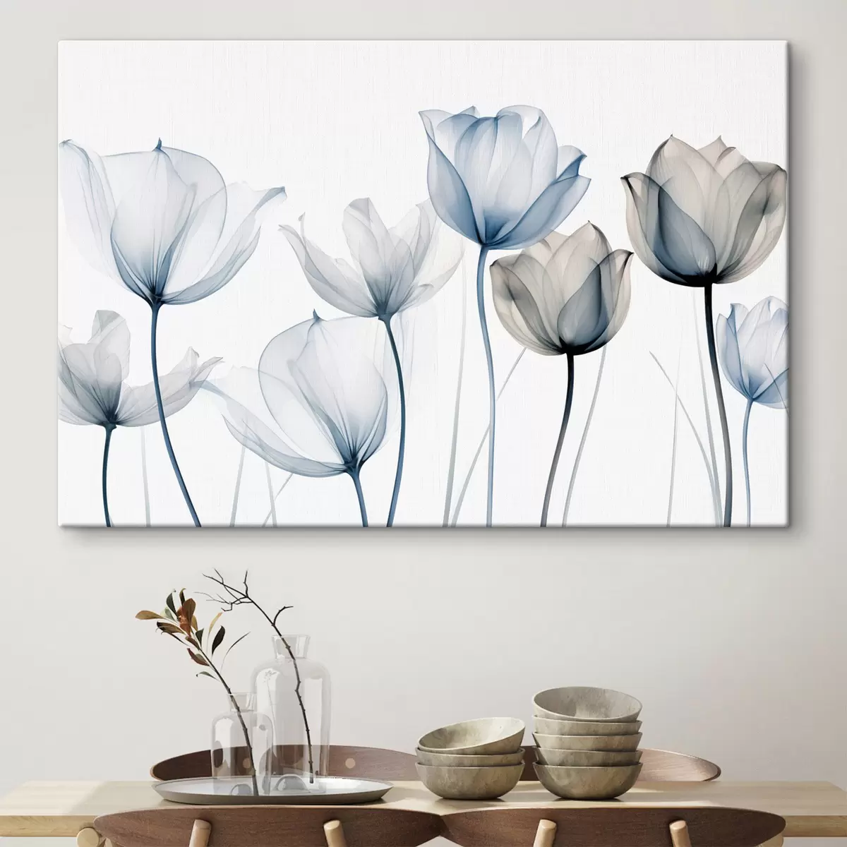 Tableau Tulipes bleues et blanches translucides à longues tiges, sur fond blanc uni s44409