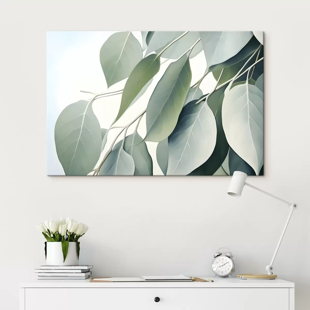 Tableau Feuilles d'eucalyptus avec une palette de couleurs douces et sourdes, une esthétique naturelle et apaisante s44410