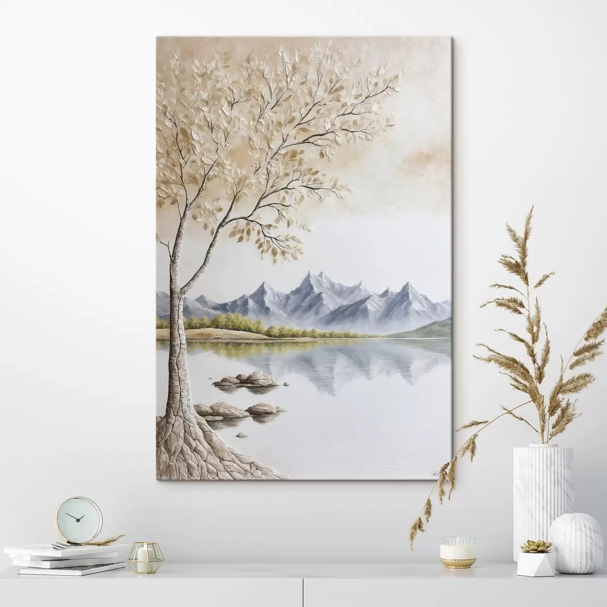 Tableau Arbre sur fond de lac et de montagnes enneigées s44459