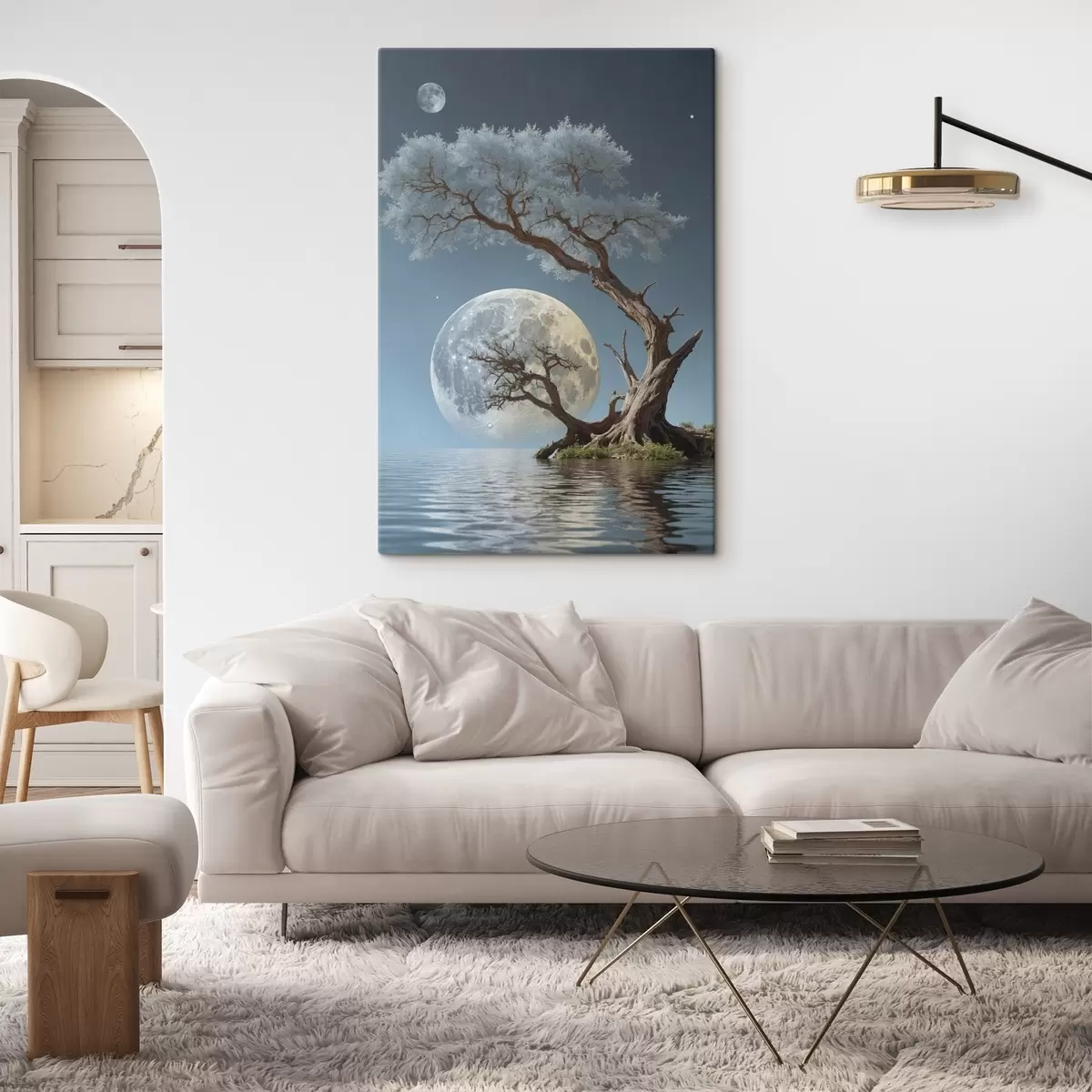 Tableau Arbre poussant au milieu d'un lac sur fond de lune s44481