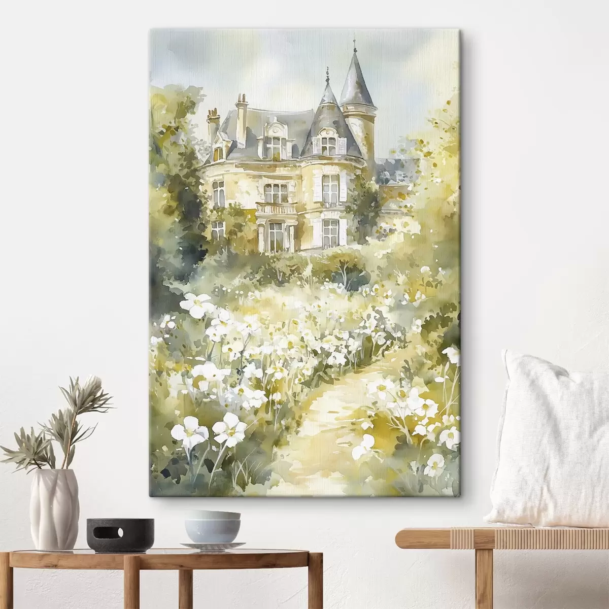 Tableau Beau château avec de la verdure et des fleurs blanches, style aquarelle Nr s44506