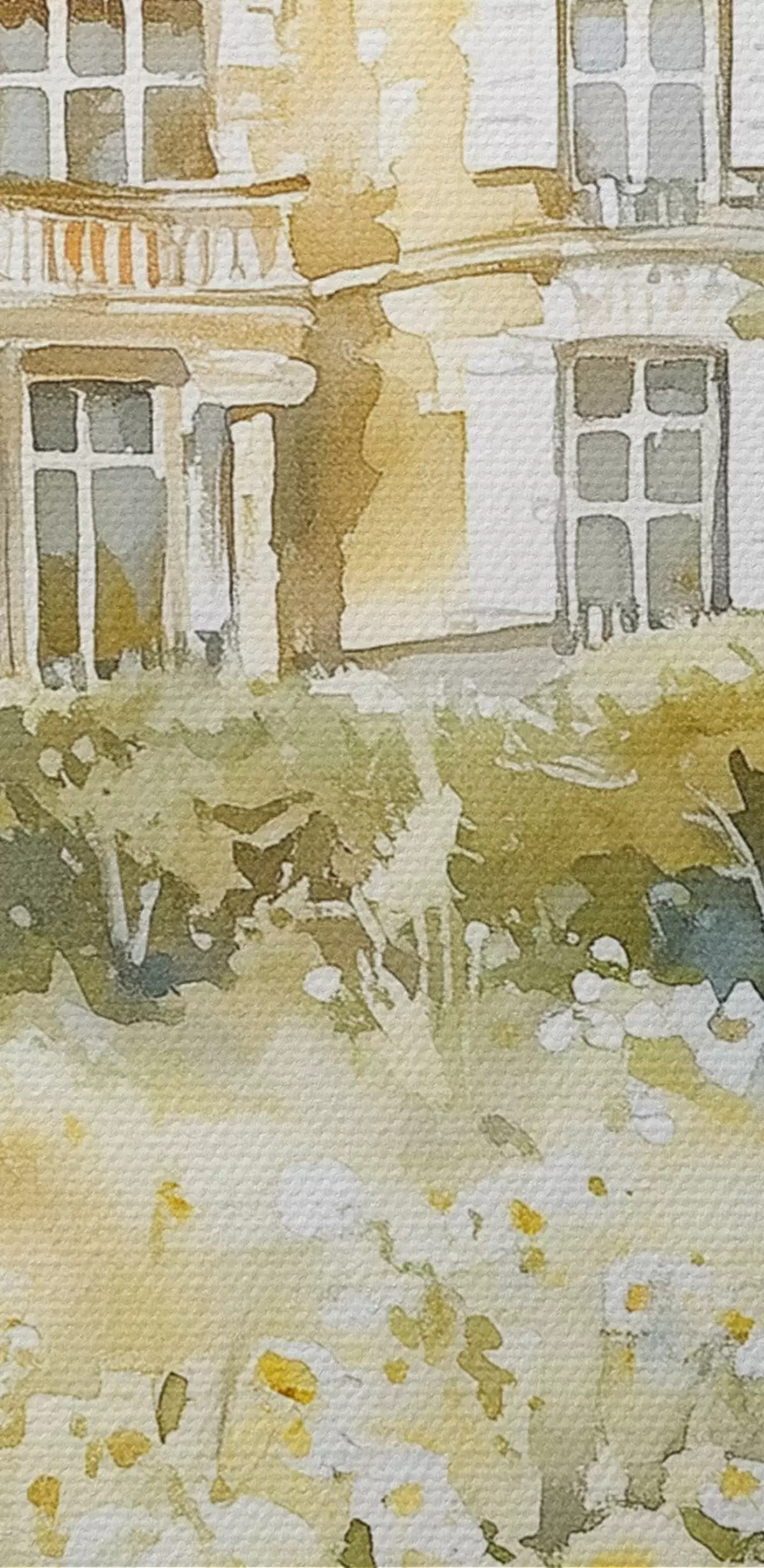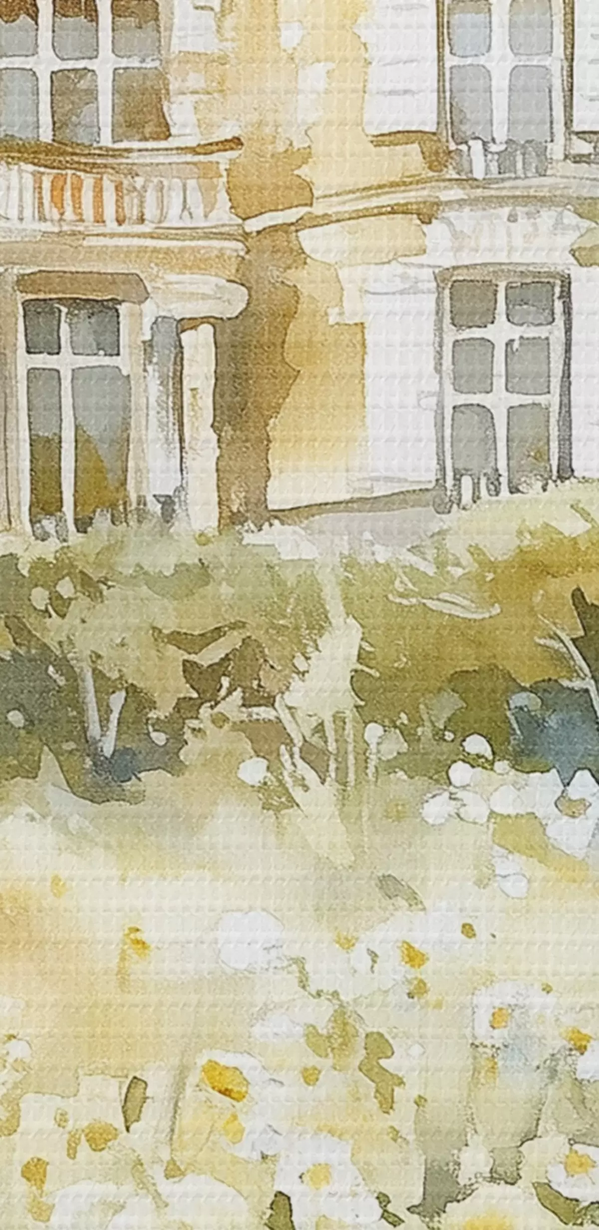 Tableau Beau château avec de la verdure et des fleurs blanches, style aquarelle s44506