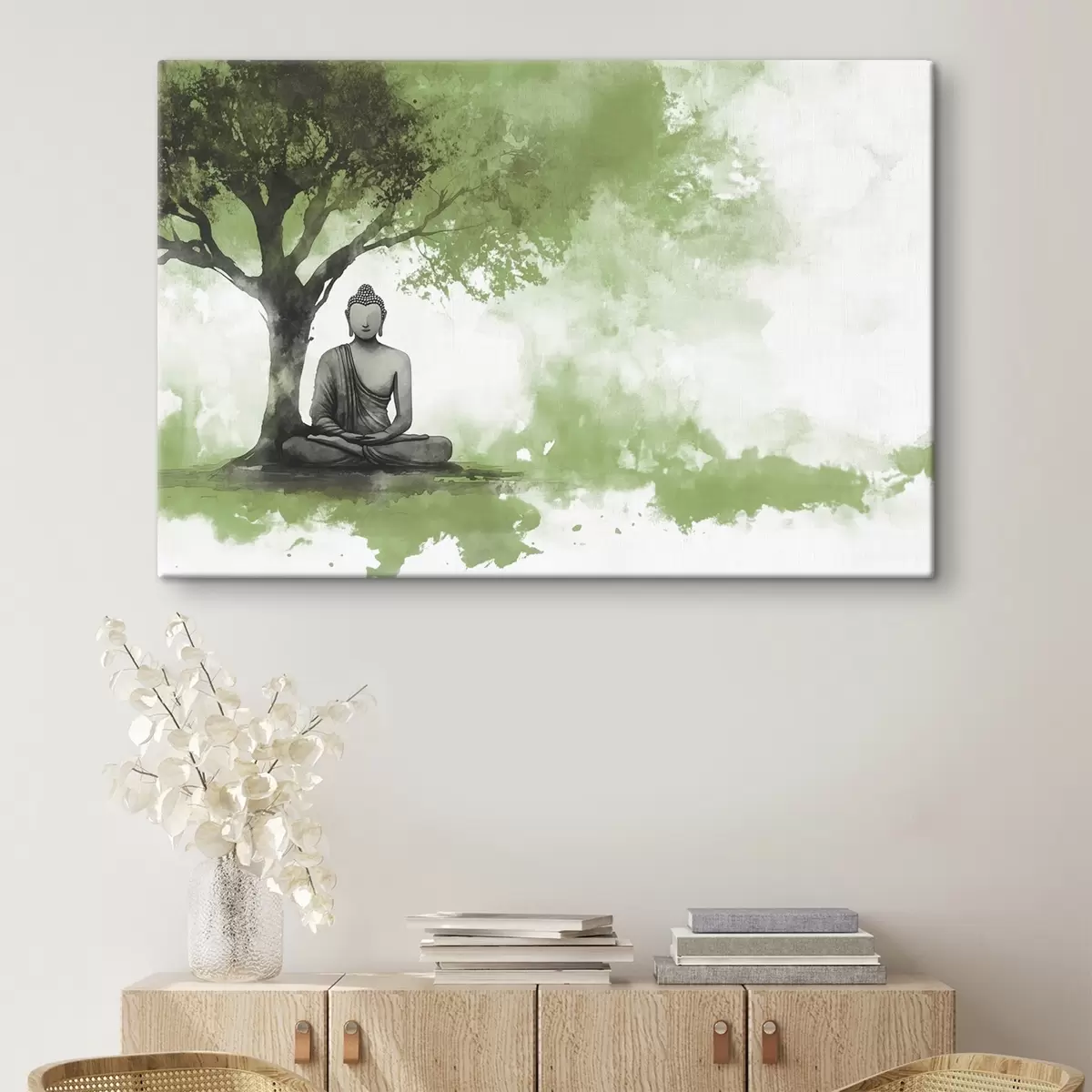 Tableau Bouddha assis sous l'arbre, méditation, spirituel, couleurs vertes Nr s44512v1
