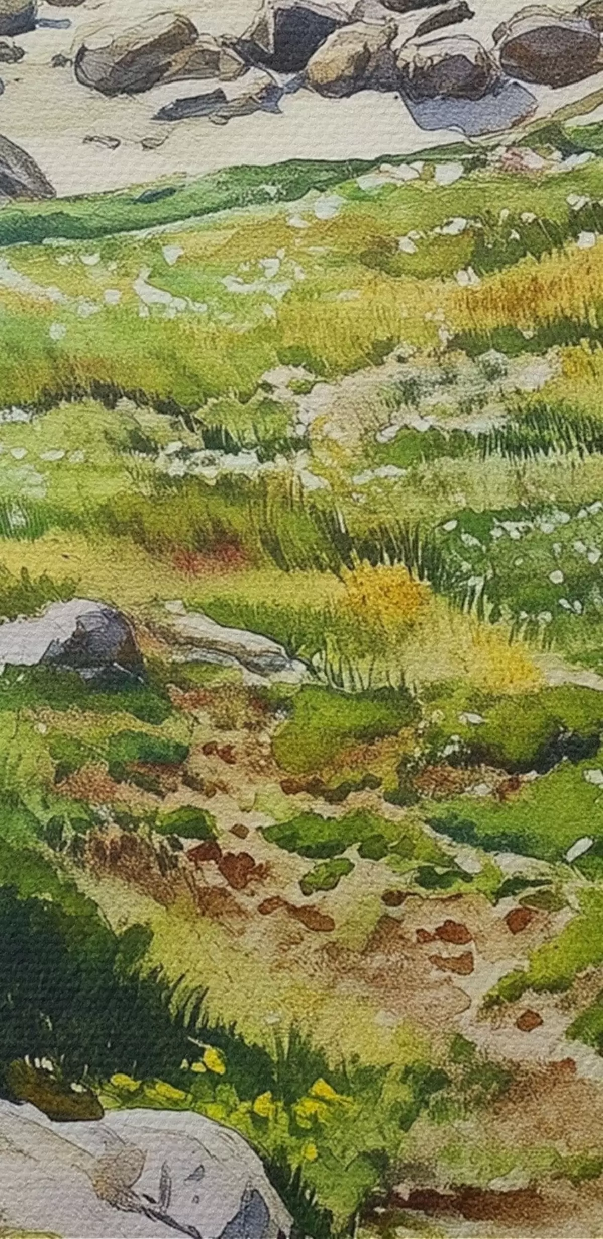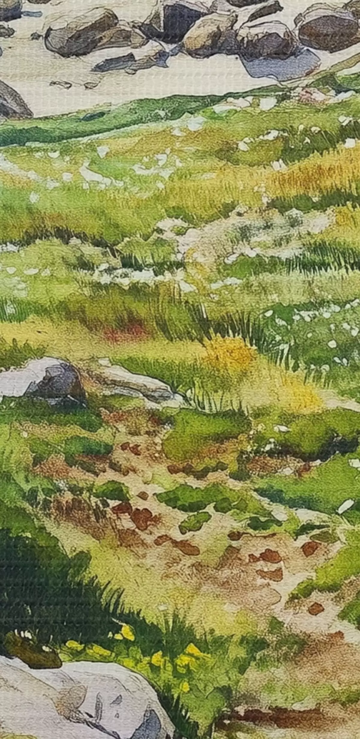 Tableau Côte maritime avec des rochers et de l'herbe verte, style aquarelle, été Nr s44616