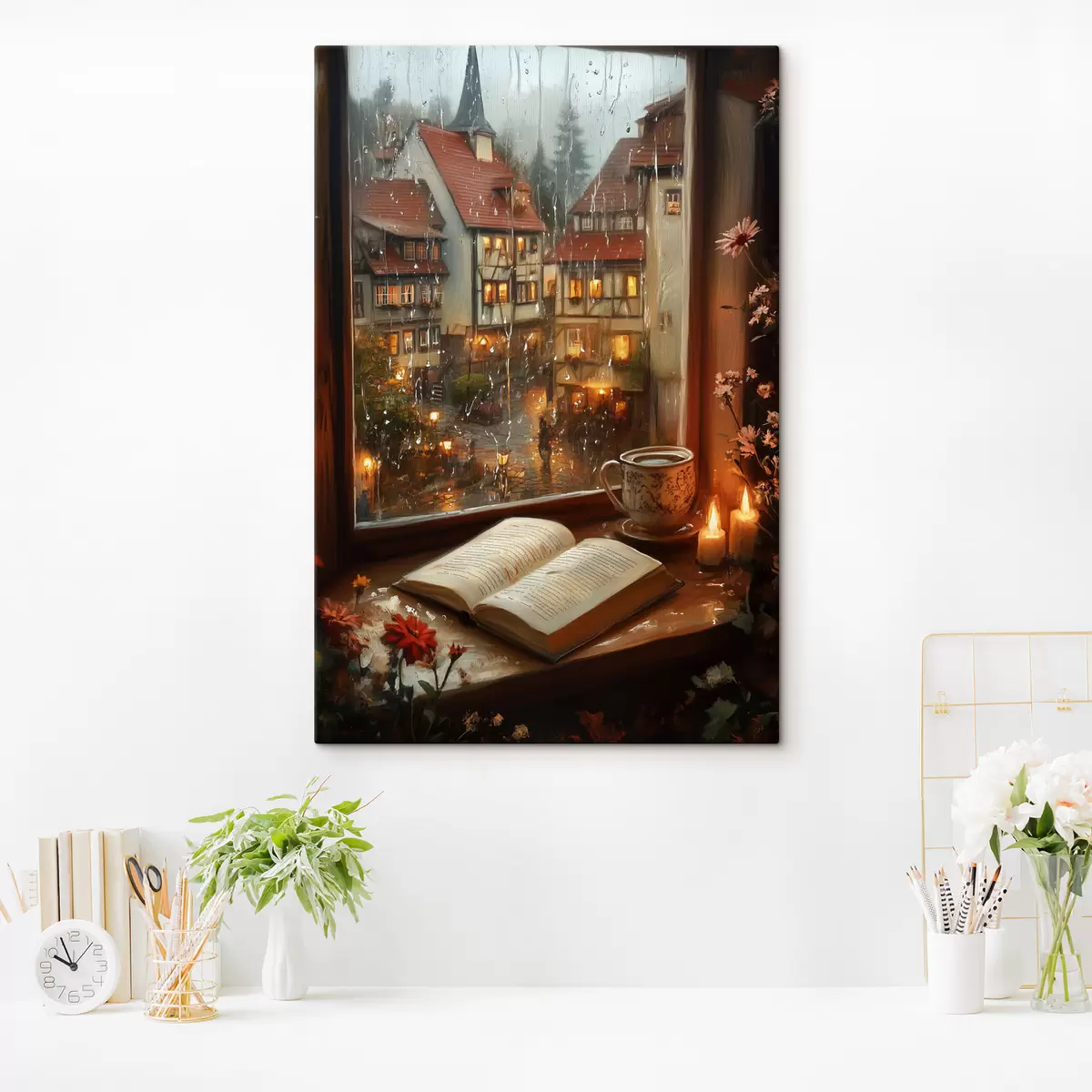 Tableau Livre sur le rebord de la fenêtre, bougies, jour de pluie, confortable s44722