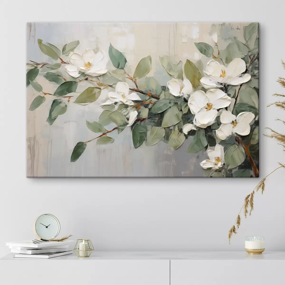 Tableau Fleurs de magnolia avec feuilles vertes sur une branche, style texturé par empâtement, palette de couleurs douces s44853