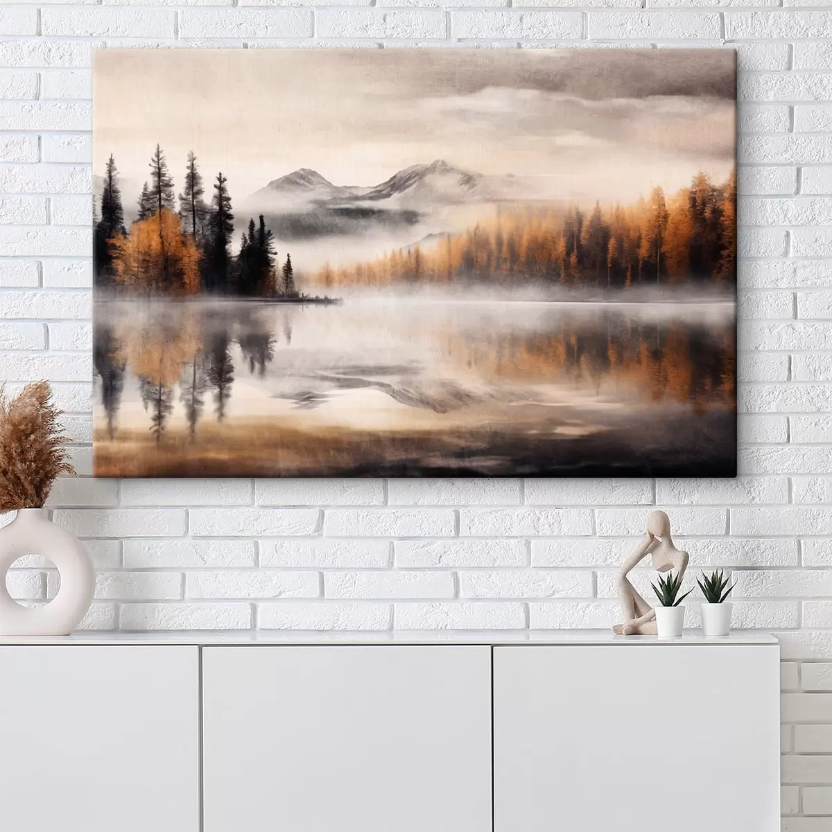 Tableau Paysage de lac brumeux et texturé avec des pins et des montagnes, ciel gris nuageux  s44856