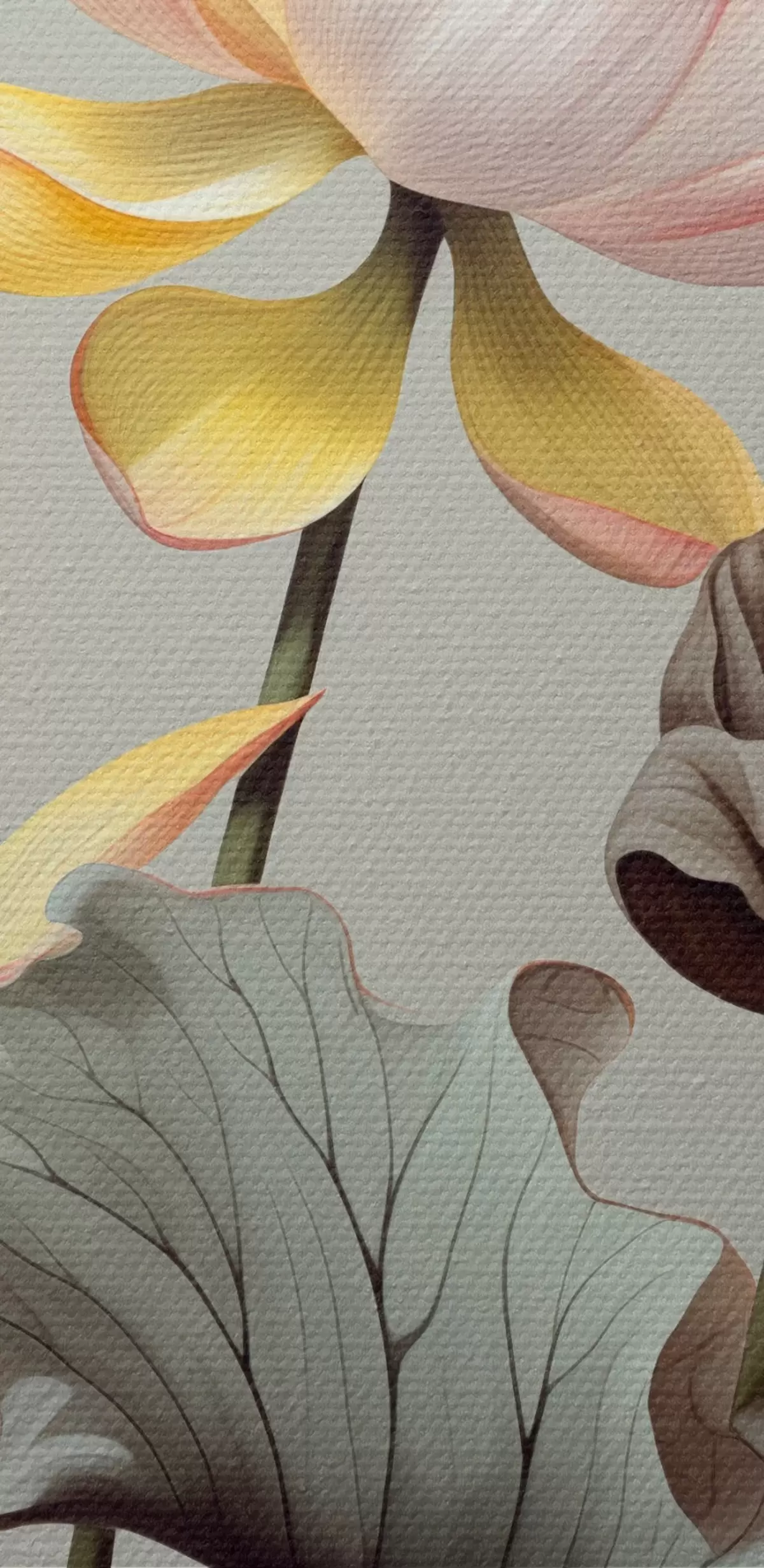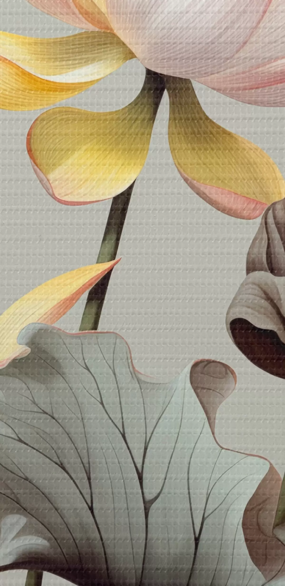 Tableau Fleurs de lotus aux pétales pastel et aux feuilles vertes, dans une palette de couleurs sourdes, sur un fond uni s44862