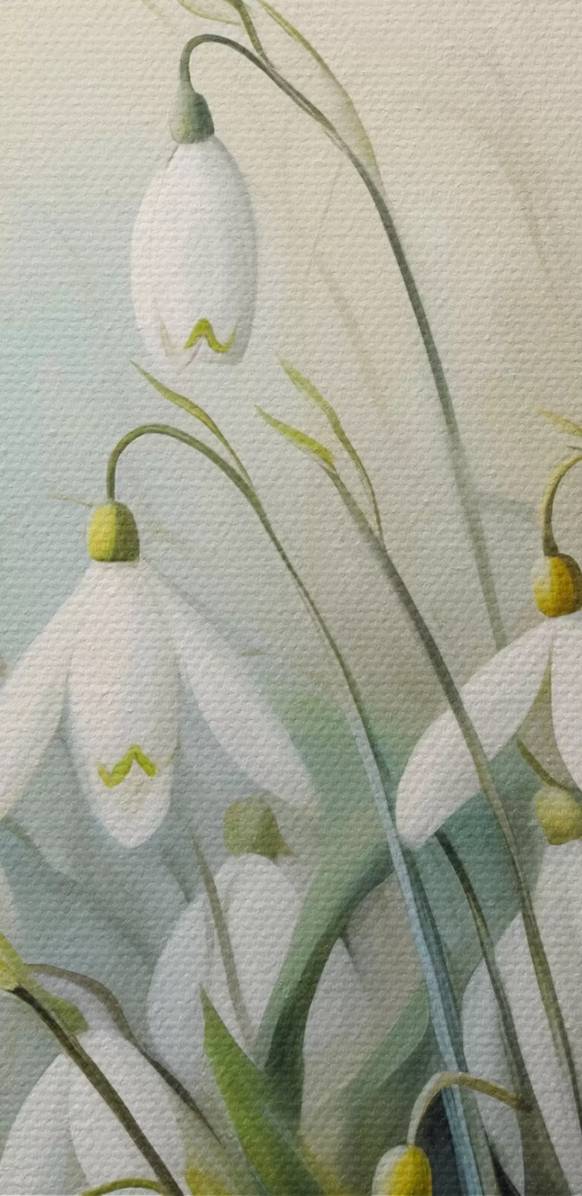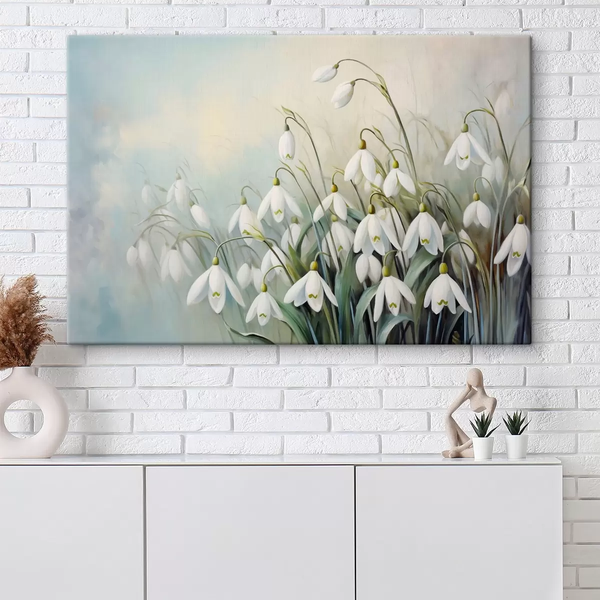 Tableau Fleurs blanches de perce-neige avec des tiges et des feuilles bleues et vertes, coups de pinceau doux, arrière-plan flou Nr s44864