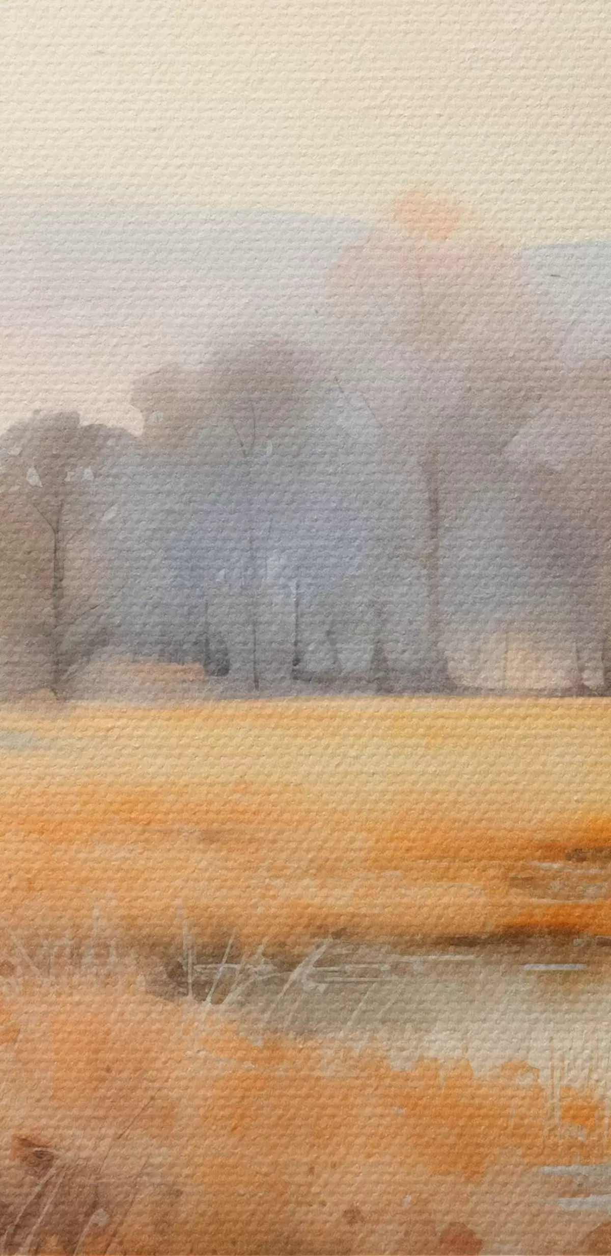 Tableau Une peinture de paysage tranquille et texturée imitant les roseaux et les arbres dénudés, l'eau calme sous un ciel.. Nr s44867