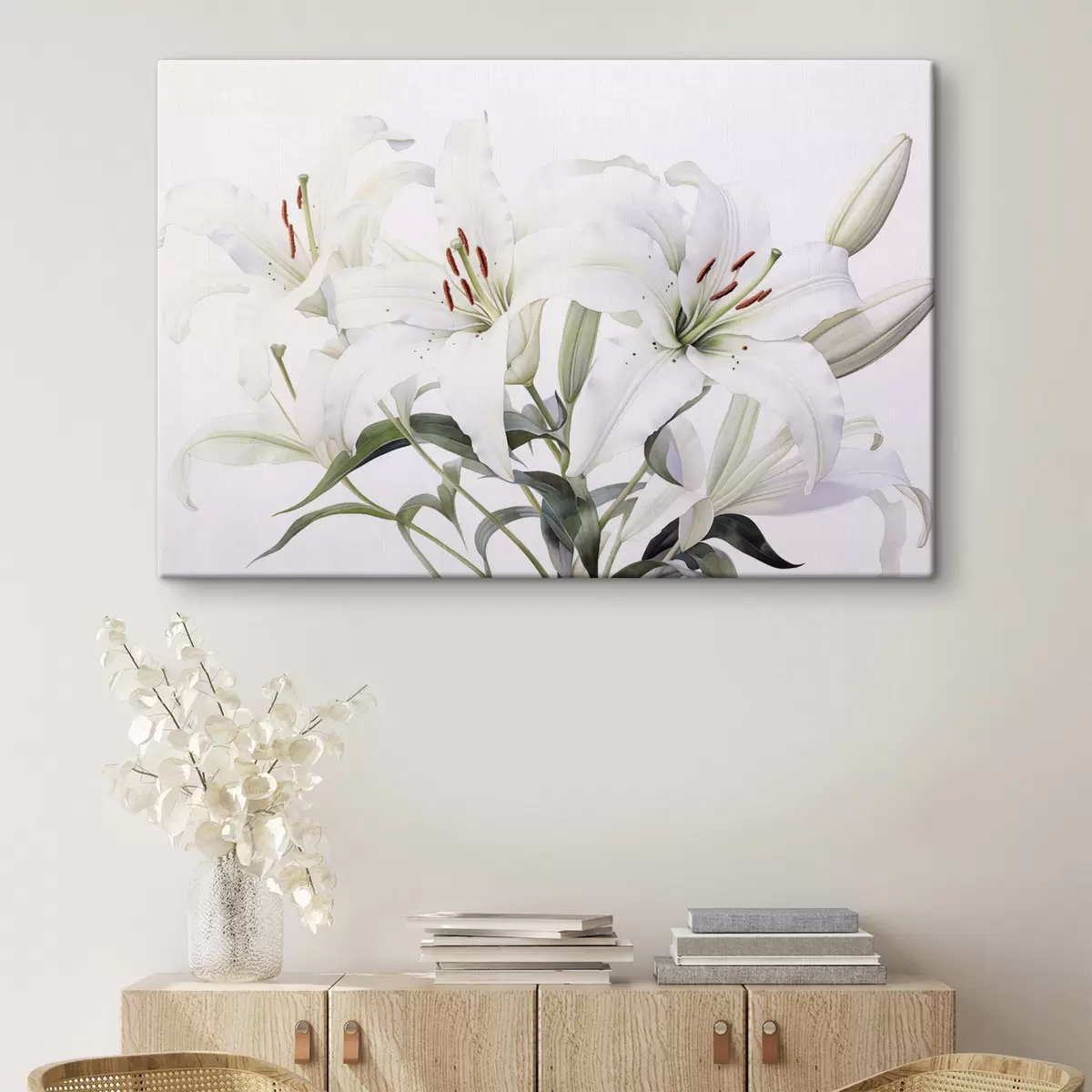 Tableau Un bouquet de lys blancs avec des feuilles vertes, des pétales délicats et un fond blanc doux Nr s44868