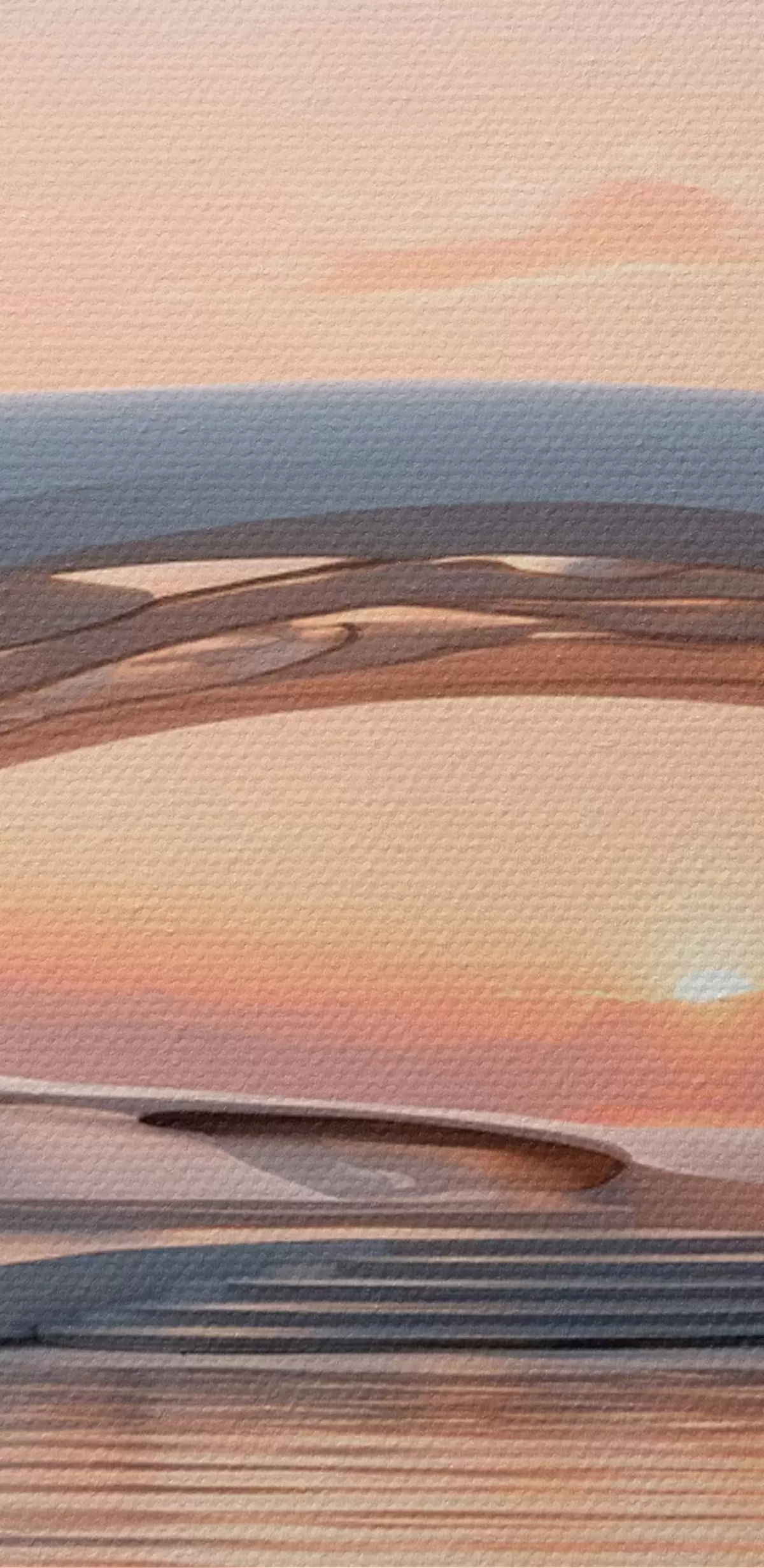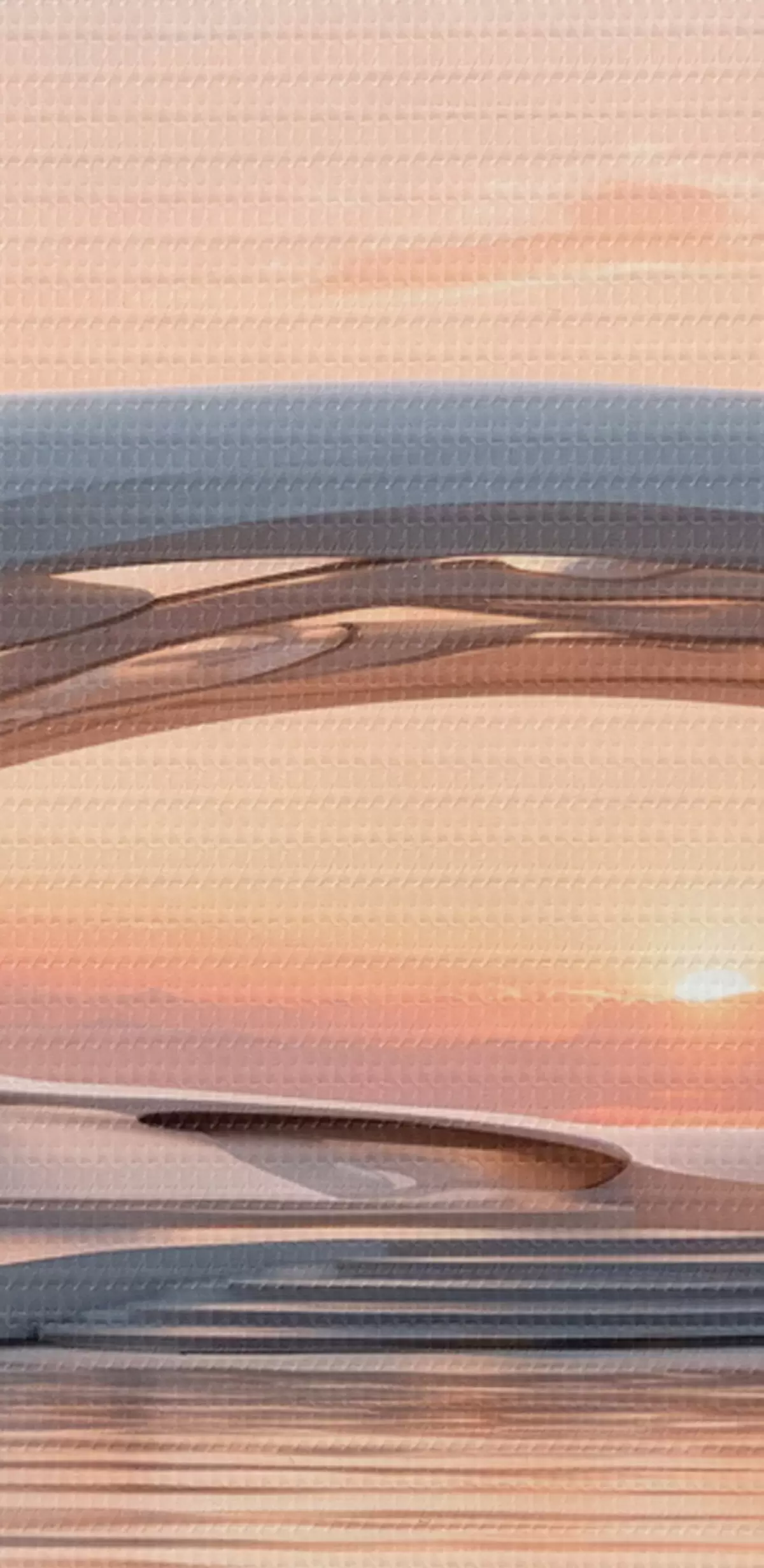 Tableau Bâtiment futuriste sur l'eau sur fond de coucher de soleil rose Nr s44884