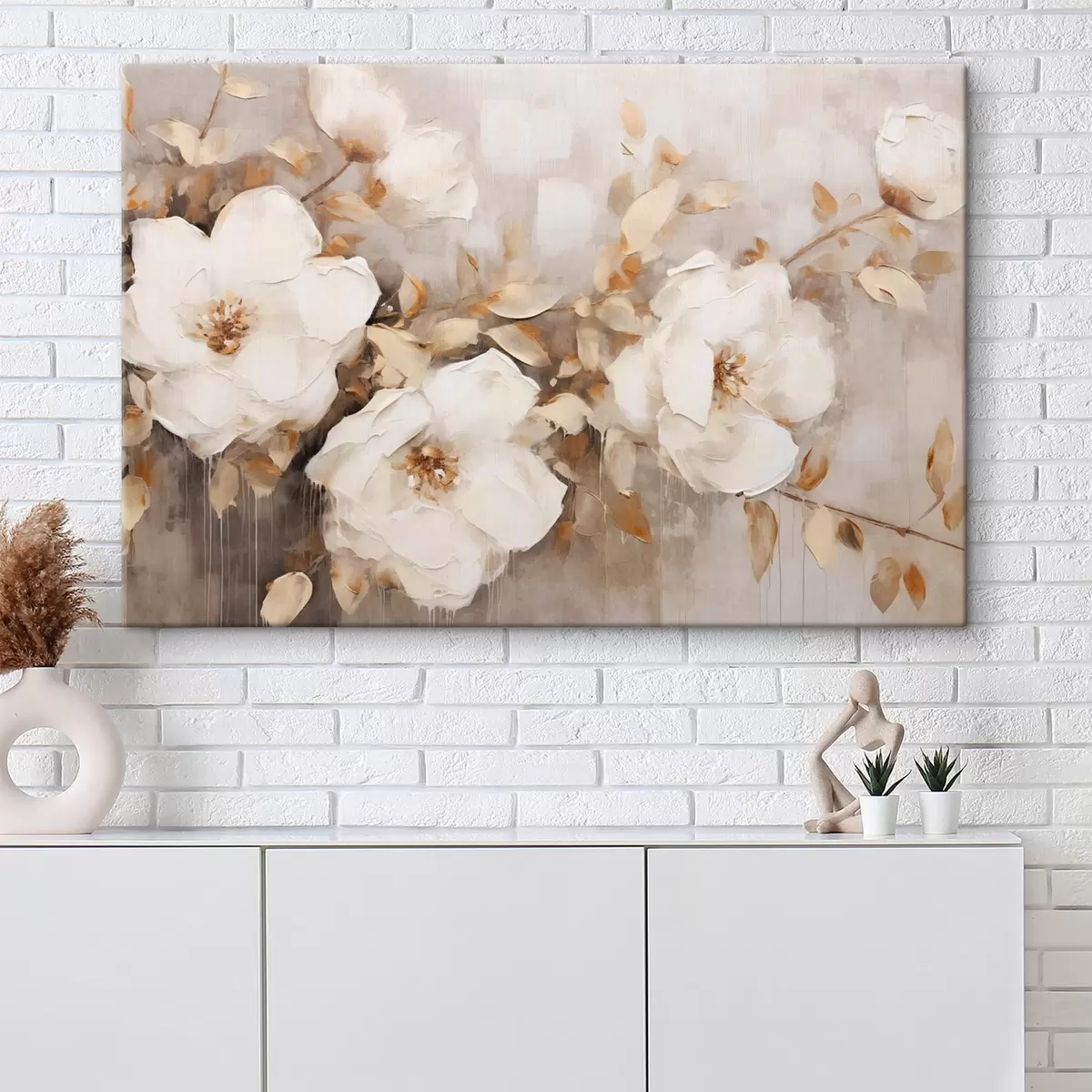 Tableau Fleurs blanches avec feuilles brunes sur fond beige, imitation peinture à l'huile, arrangement floral, art botanique  s44922