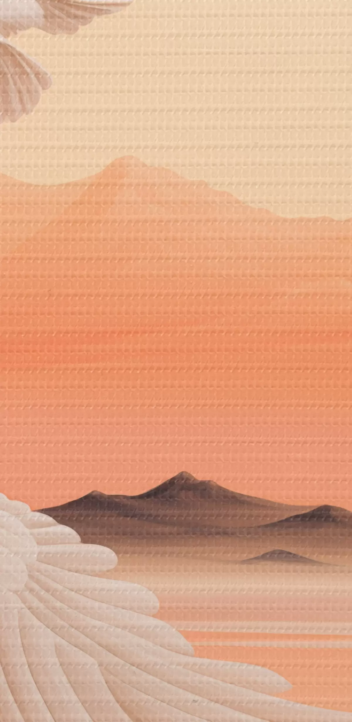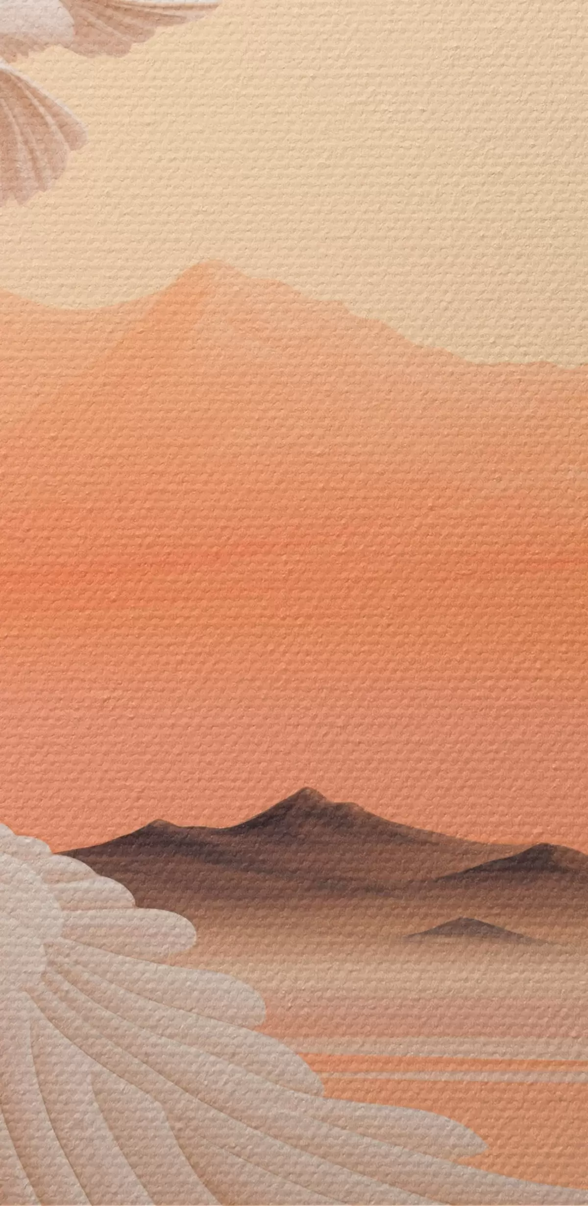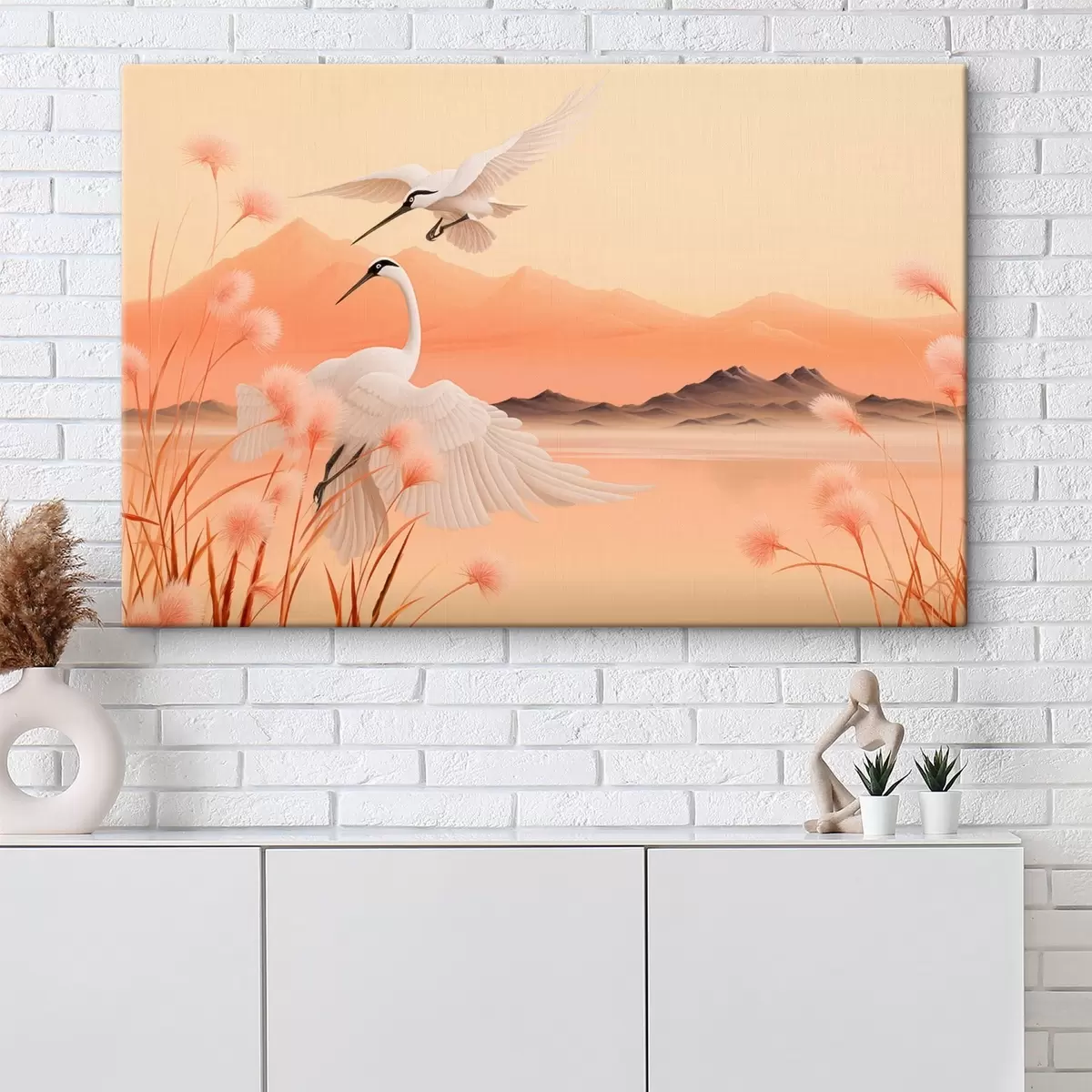 Tableau Grues blanches avec roseaux roses au premier plan, montagnes et lac à l'arrière-plan, lumière orange douce Nr s44925