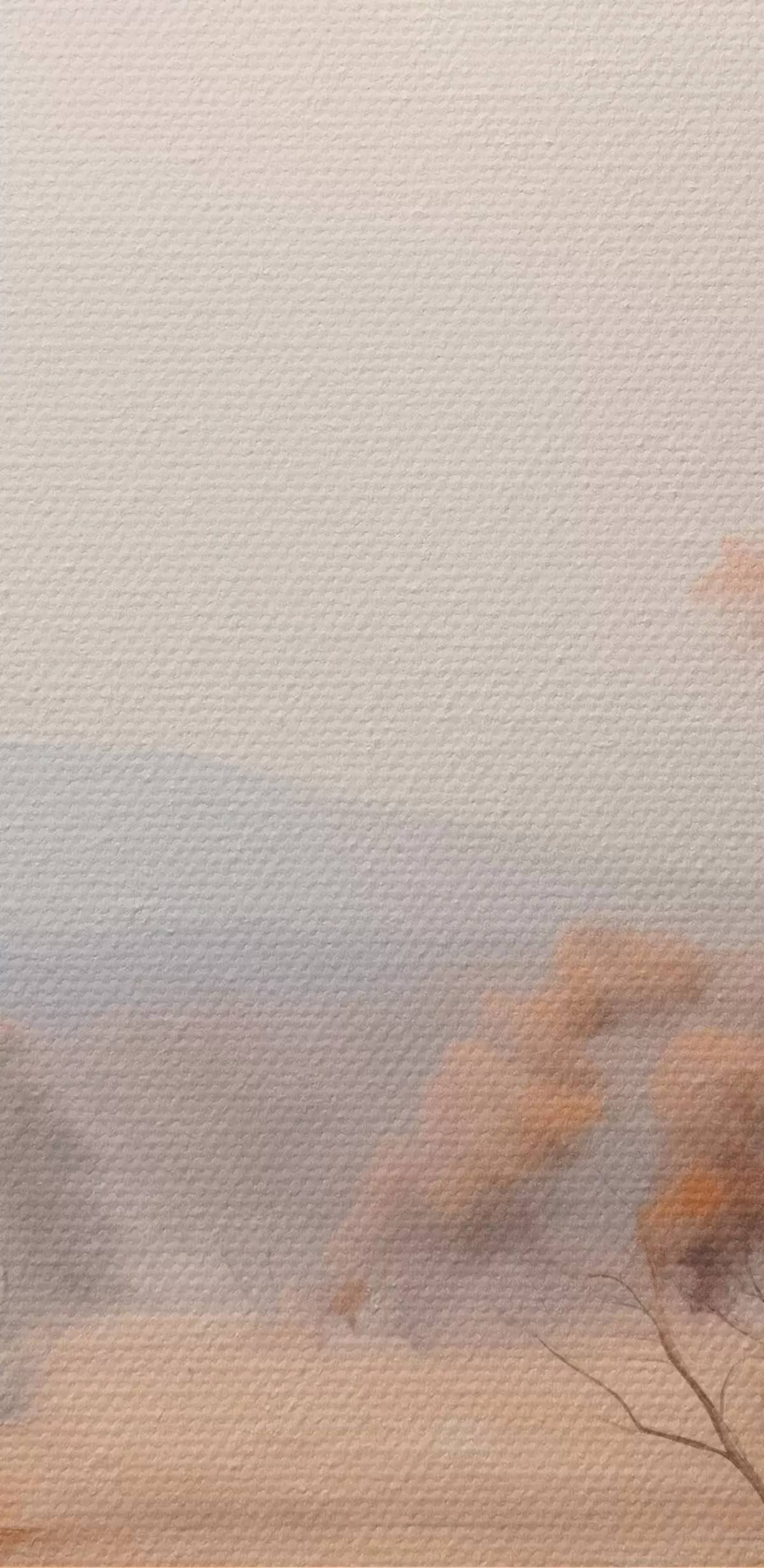 Tableau Un champ avec de l'herbe orange et quelques arbres avec des feuilles orange, des montagnes en arrière-plan avec un ciel nuageux Nr s44927