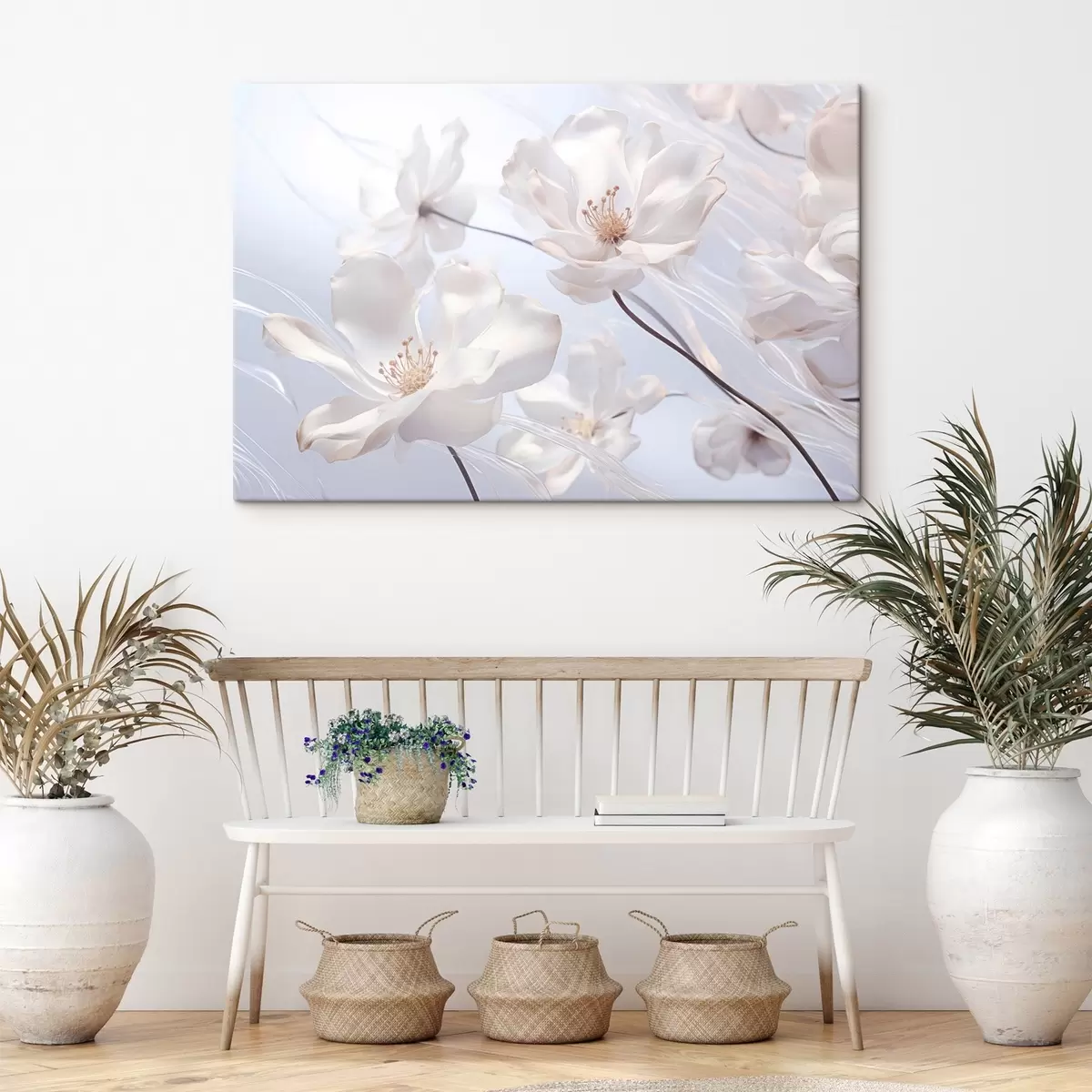 Tableau Fleurs blanches aux pétales translucides, fond bleu clair doux, élégant, romantique, délicat, rêveur Nr s44931