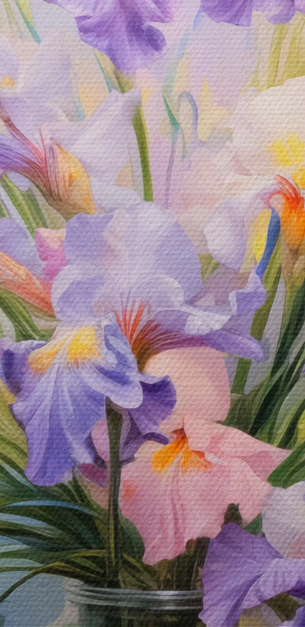 Tableau Un vase avec de nombreux iris pastel, quelques pétales éparpillés sur la table, fond pastel doux avec des tons bleus et roses s44933