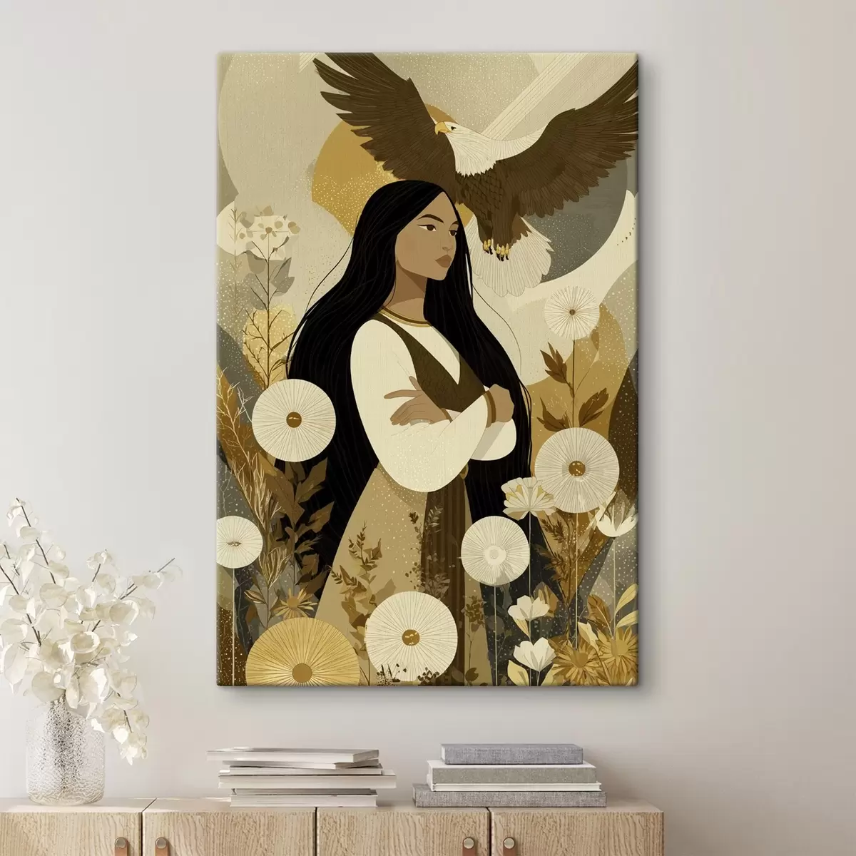 Tableau Femme avec aigle volant, style tribal, couleurs beiges s44977