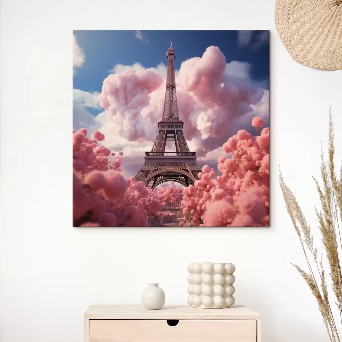 Tableau Tour Eiffel dans des nuages roses en style fantaisiste s45036