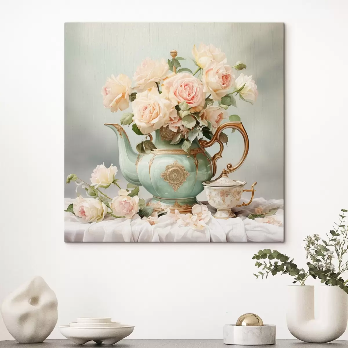 Tableau Nature morte avec des roses délicates dans un service à thé s45045
