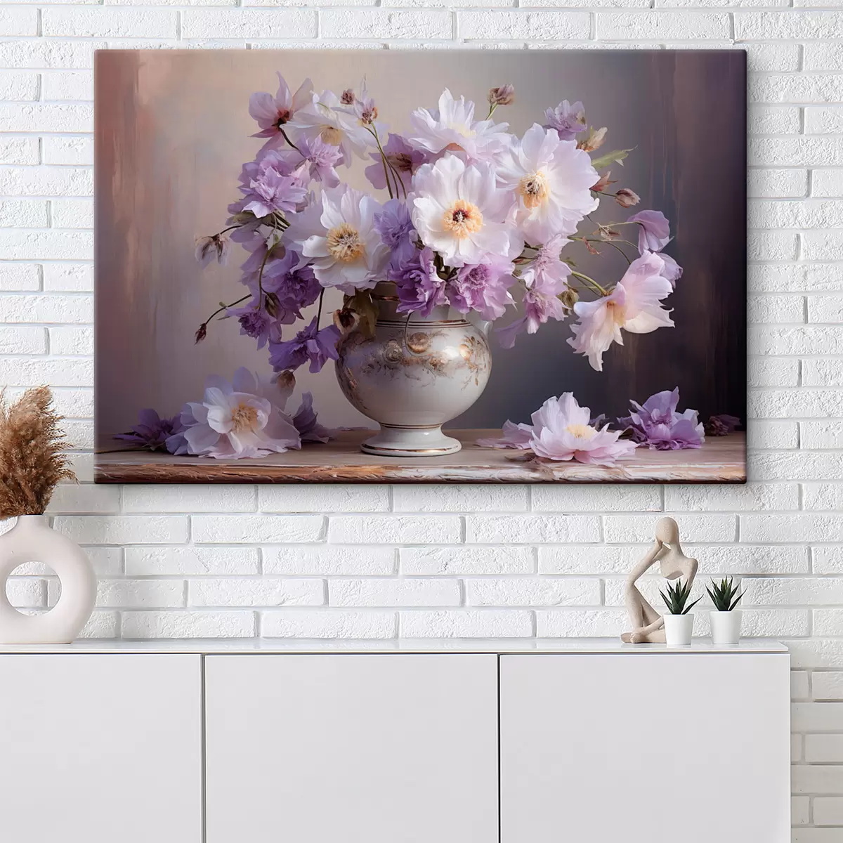 Tableau Nature morte florale : fleurs blanches et violettes dans un style artistique s45058