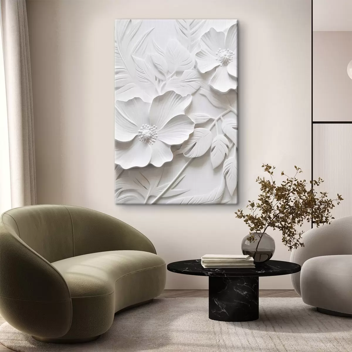 Tableau Fleurs blanches décoratives minimalistes avec feuilles, imitation relief, fond blanc Nr s45180