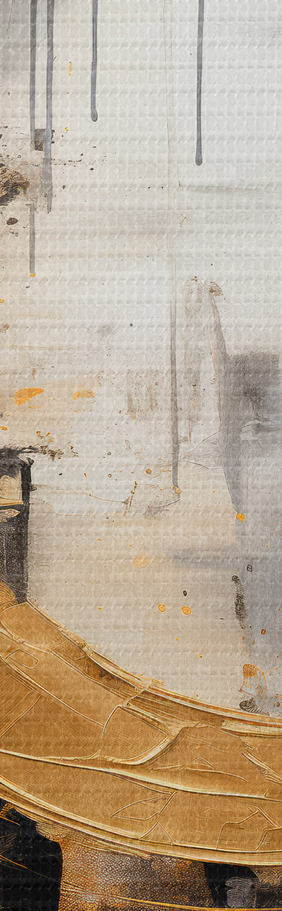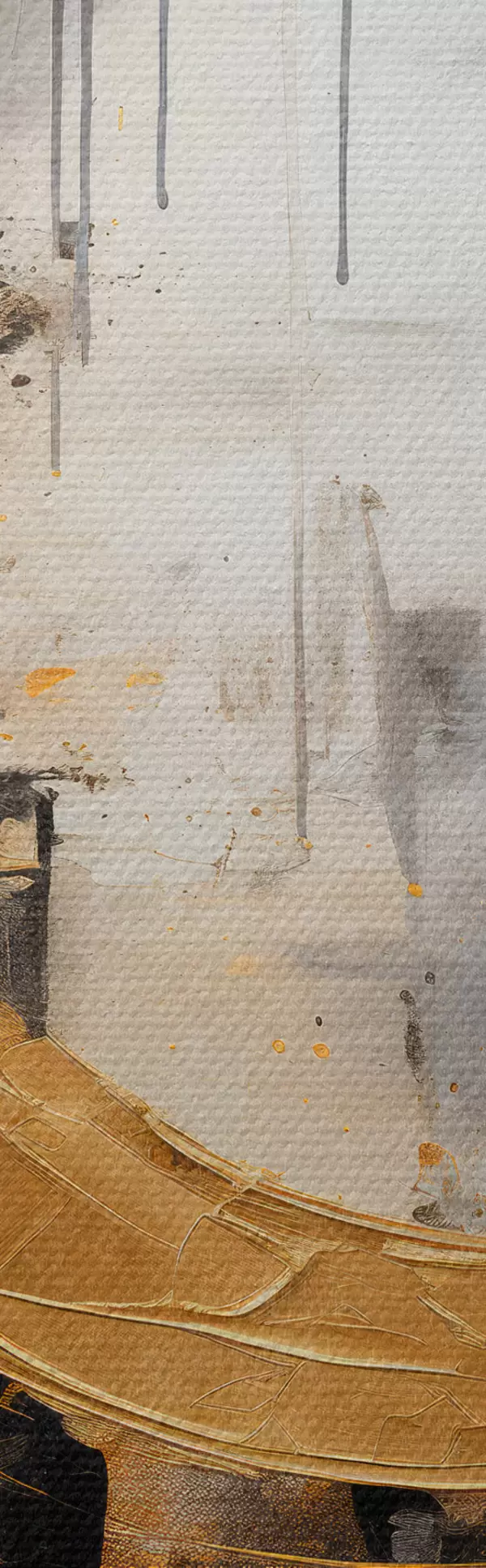 Tableau Peinture abstraite avec des cercles, des lignes noires et jaunes, et un arrière-plan dans les tons gris et blancs s45186