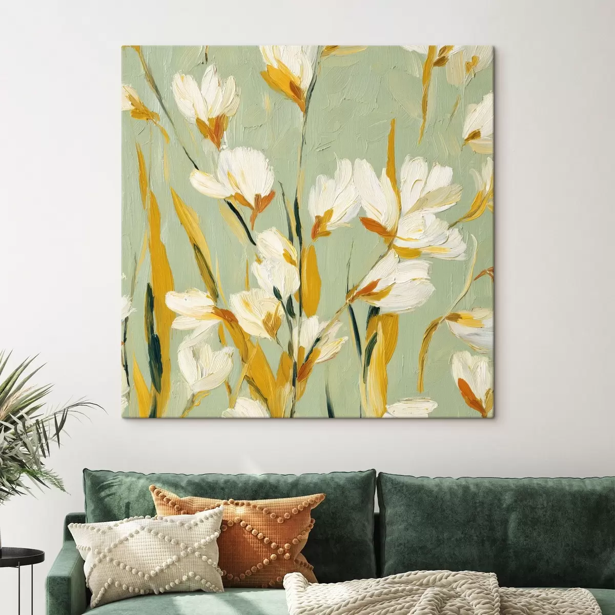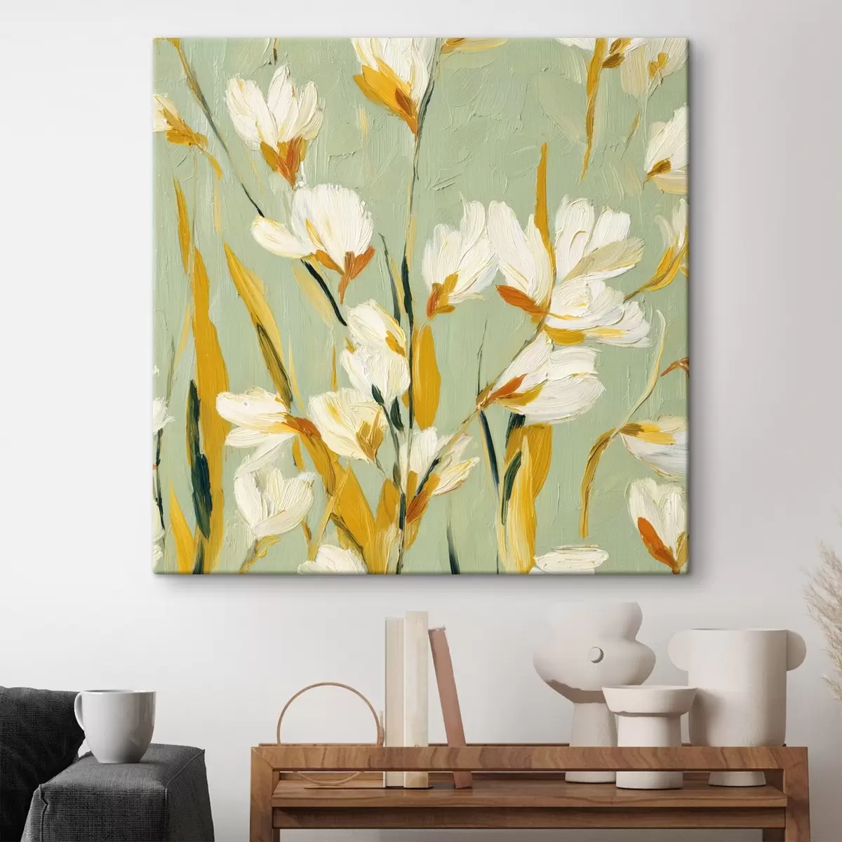Tableau Fleurs blanches avec des accents jaunes sur un fond menthe en style coup de pinceau s45264