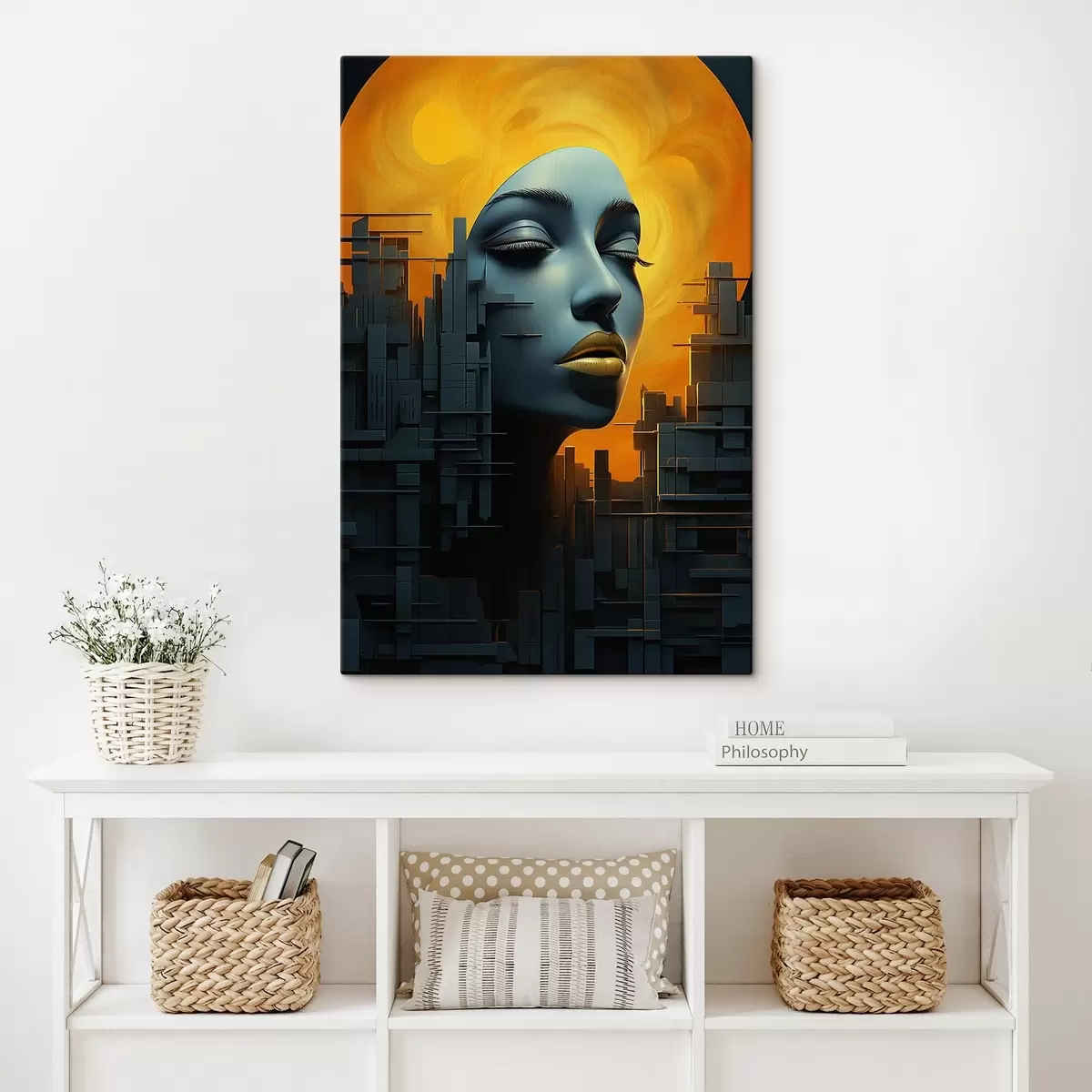 Tableau Personnes, visage de fille, ville sur fond abstrait s45342