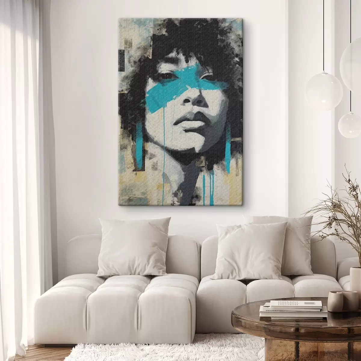 Tableau Portrait en techniques mixtes avec des fragments de touches de couleur et de textures s45417