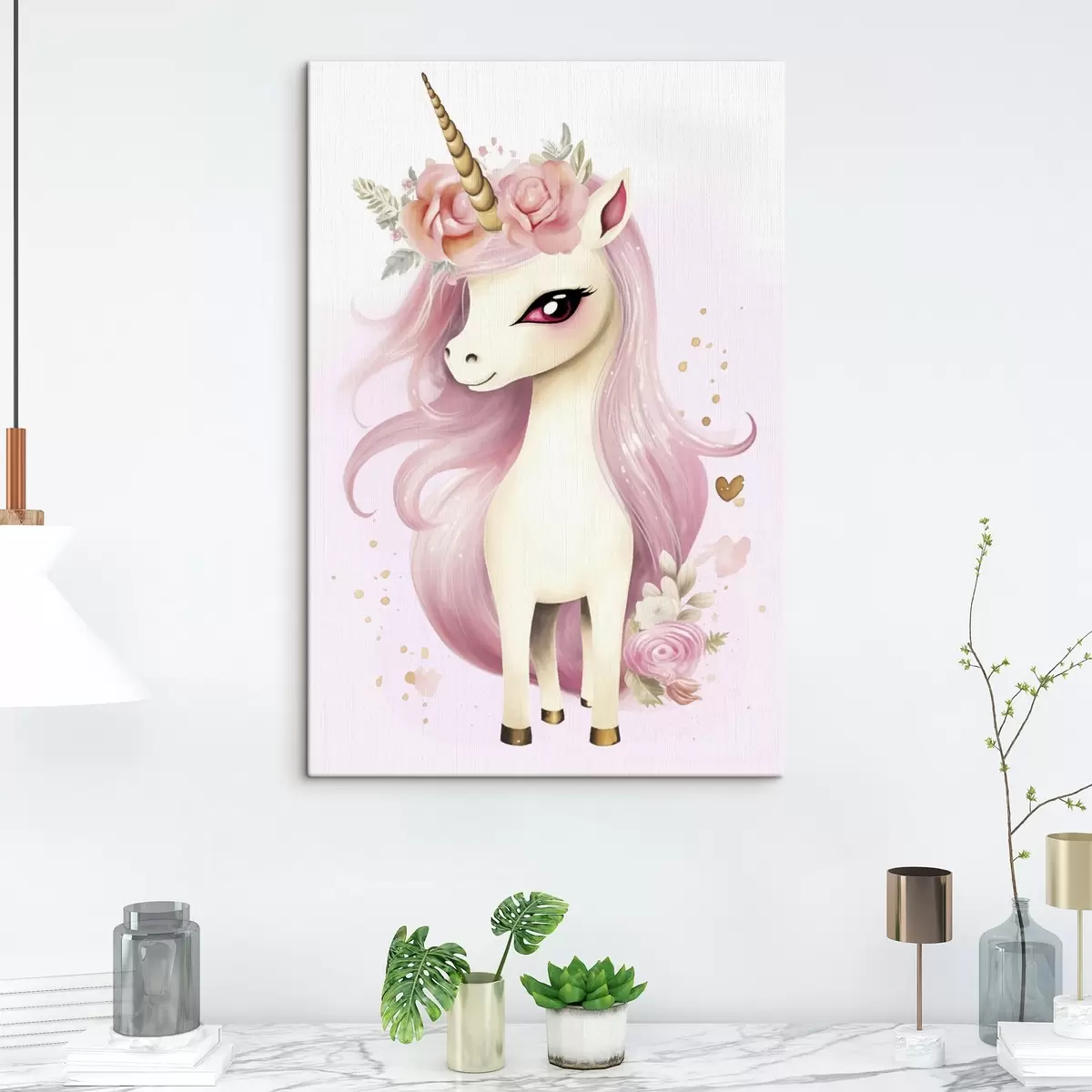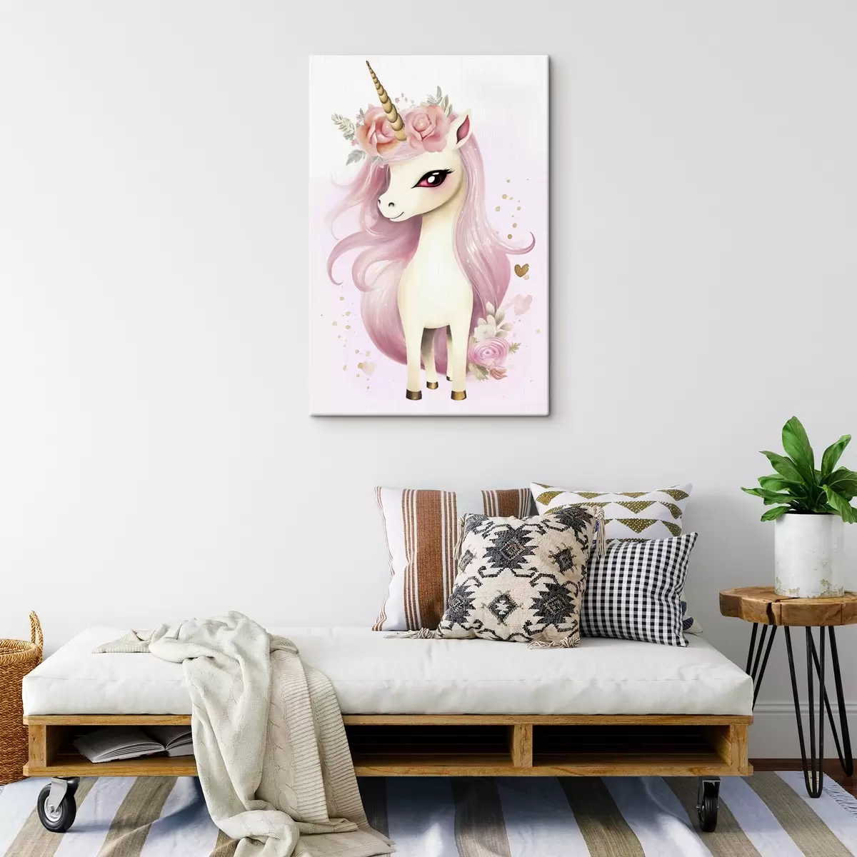 Tableau Licorne avec crinière rose et couronne de fleurs s45484