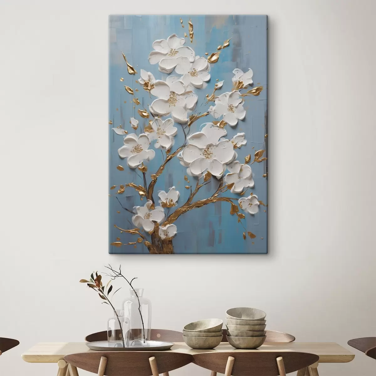 Tableau Fleurs blanches sur une branche : motif décoratif dans les tons bleu clair s45541