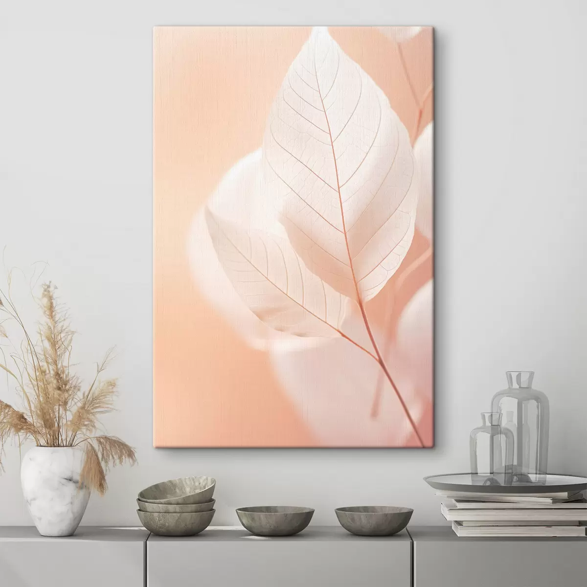 Tableau Feuilles délicates et translucides avec des motifs de veines complexes, fond pêche doux, composition botanique minimaliste Nr s45555