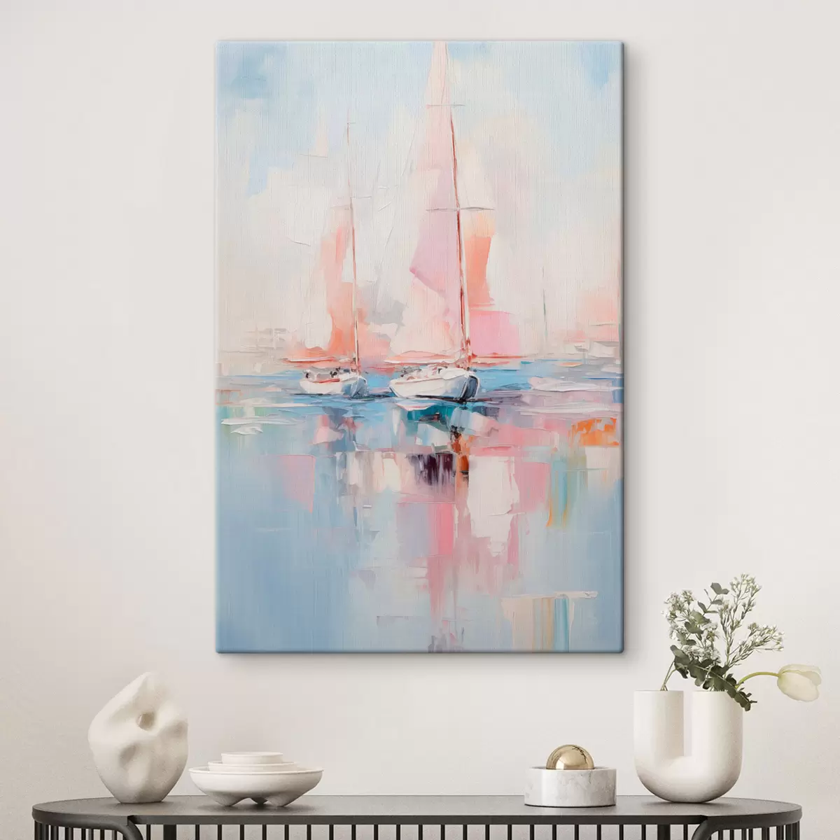 Tableau Voiliers aux voiles roses flottant sur une mer calme, reflets des bateaux dans l'eau, couleurs douces et pastel Nr s45557
