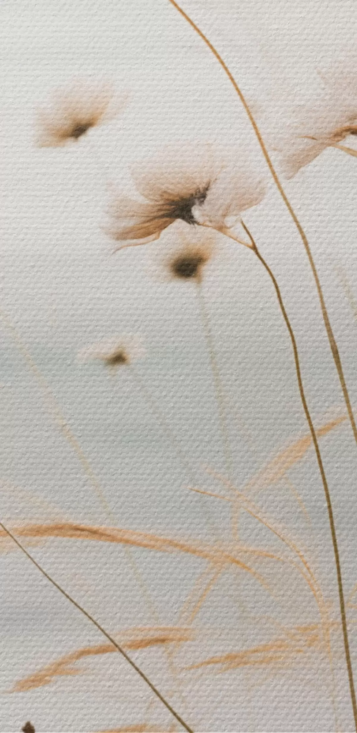Tableau De l'herbe de coton et d'autres herbes sèches devant une mer floue, palette de couleurs douces et sourdes s45562