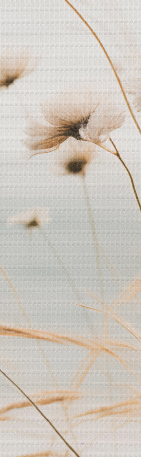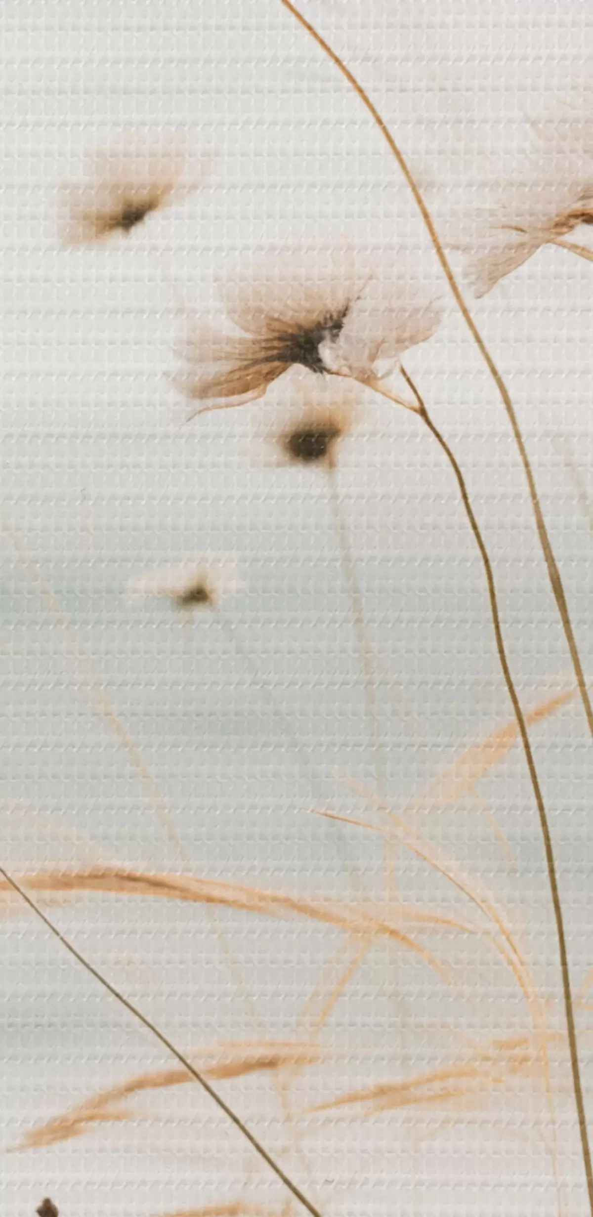 Tableau De l'herbe de coton et d'autres herbes sèches devant une mer floue, palette de couleurs douces et sourdes Nr s45562