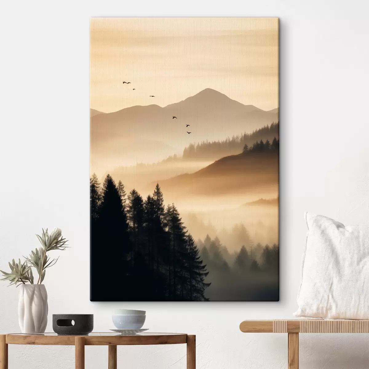 Tableau Un paysage de montagne avec une forêt et des oiseaux volant dans le ciel, le tout recouvert d'une épaisse couche de brouillard au lever du soleil s45563
