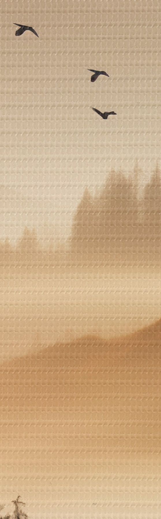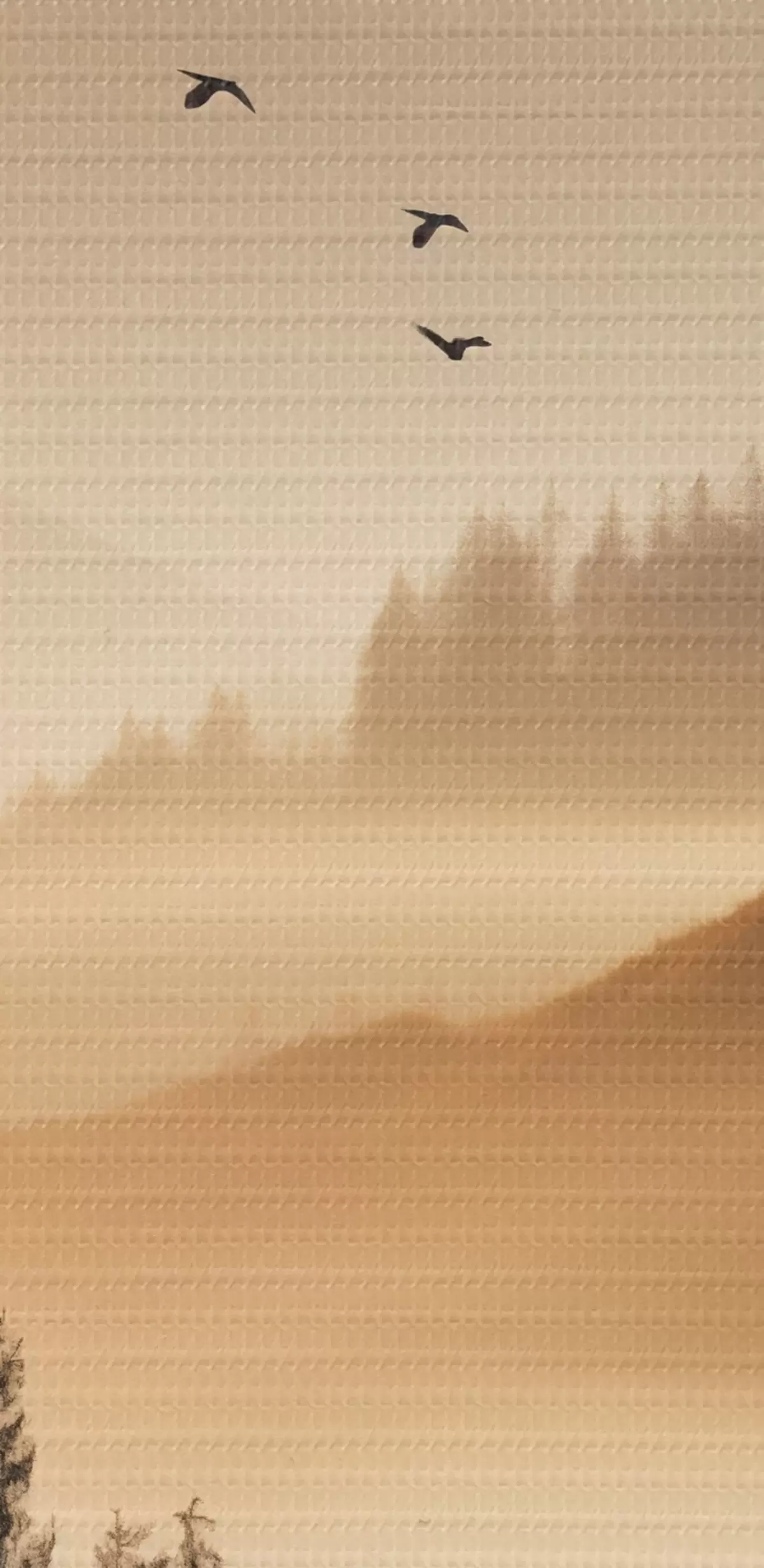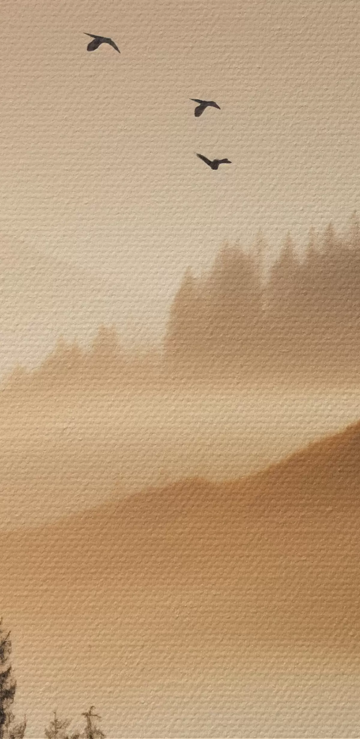 Tableau Un paysage de montagne avec une forêt et des oiseaux volant dans le ciel, le tout recouvert d'une épaisse couche de brouillard au lever du soleil Nr s45563