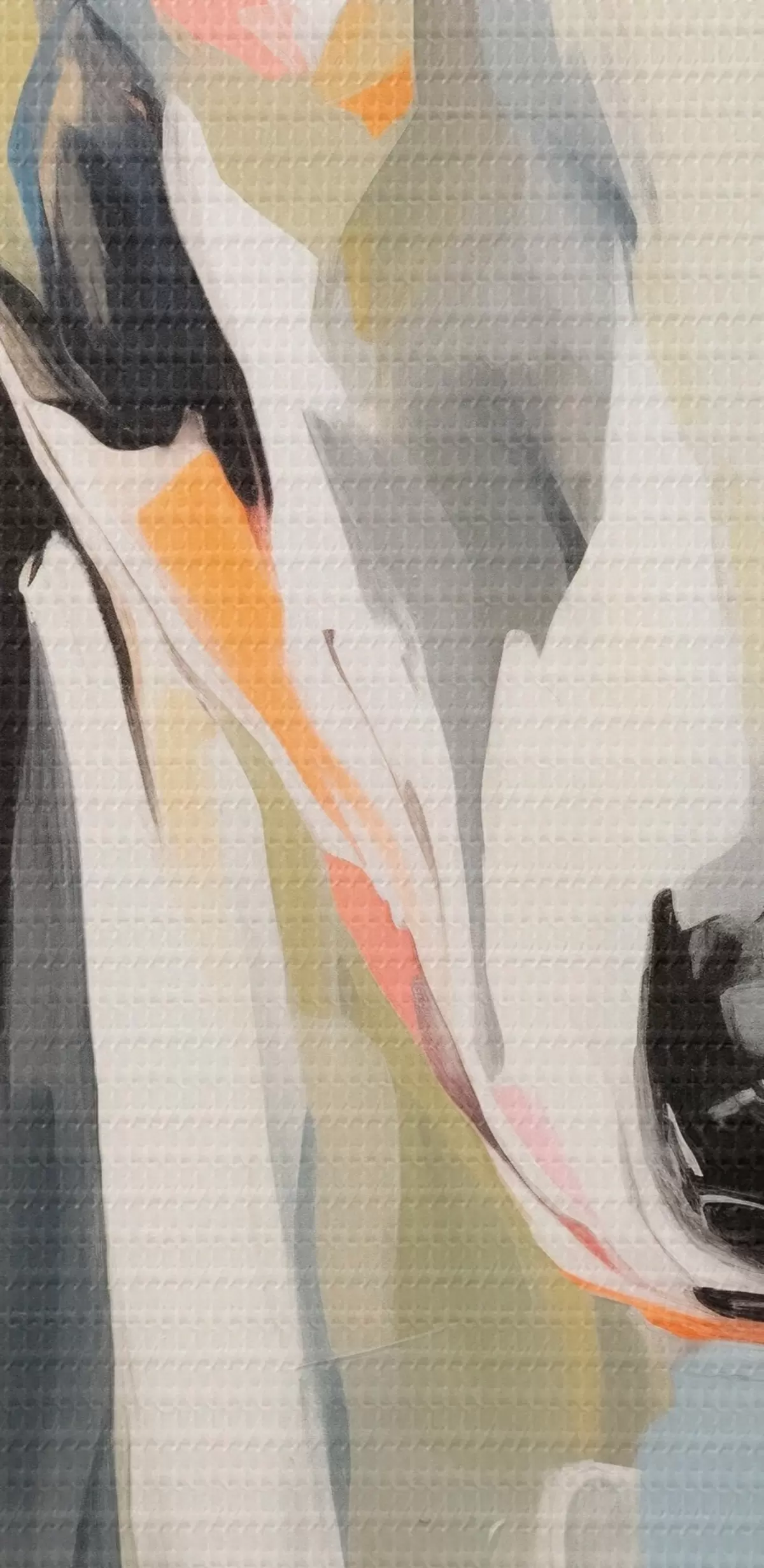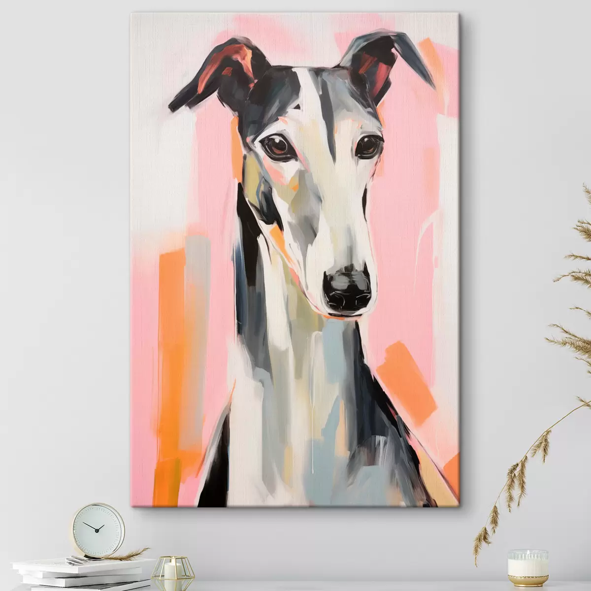 Tableau Un lévrier sur un fond de coups de pinceau roses, orange et blancs s45566