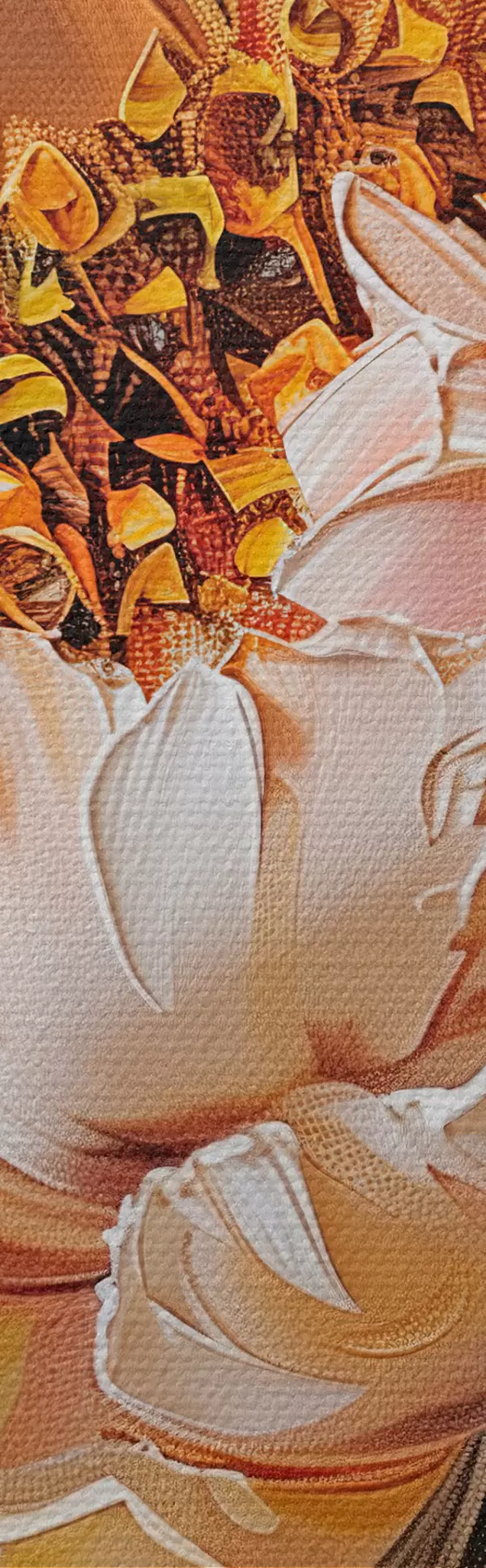 Trois types de matériaux peuvent être commandés : Economic Canvas - matériau dense et durable pour l'impression numérique, identique à la toile de peintre, surface imperméable, reproduction réaliste des détails, matériau à grain moyen. Premium Canvas - la texture ressemble à celle d'une toile de peintre (petits fils entrelacés). Reproduction douce et détaillée de l'image sur une surface mate. Eco-Premium - tissu 100 % coton de haute qualité. Grâce aux fibres naturelles de coton, le matériau est durable et résistant à l'usure. Excellente reproduction des couleurs et des détails.