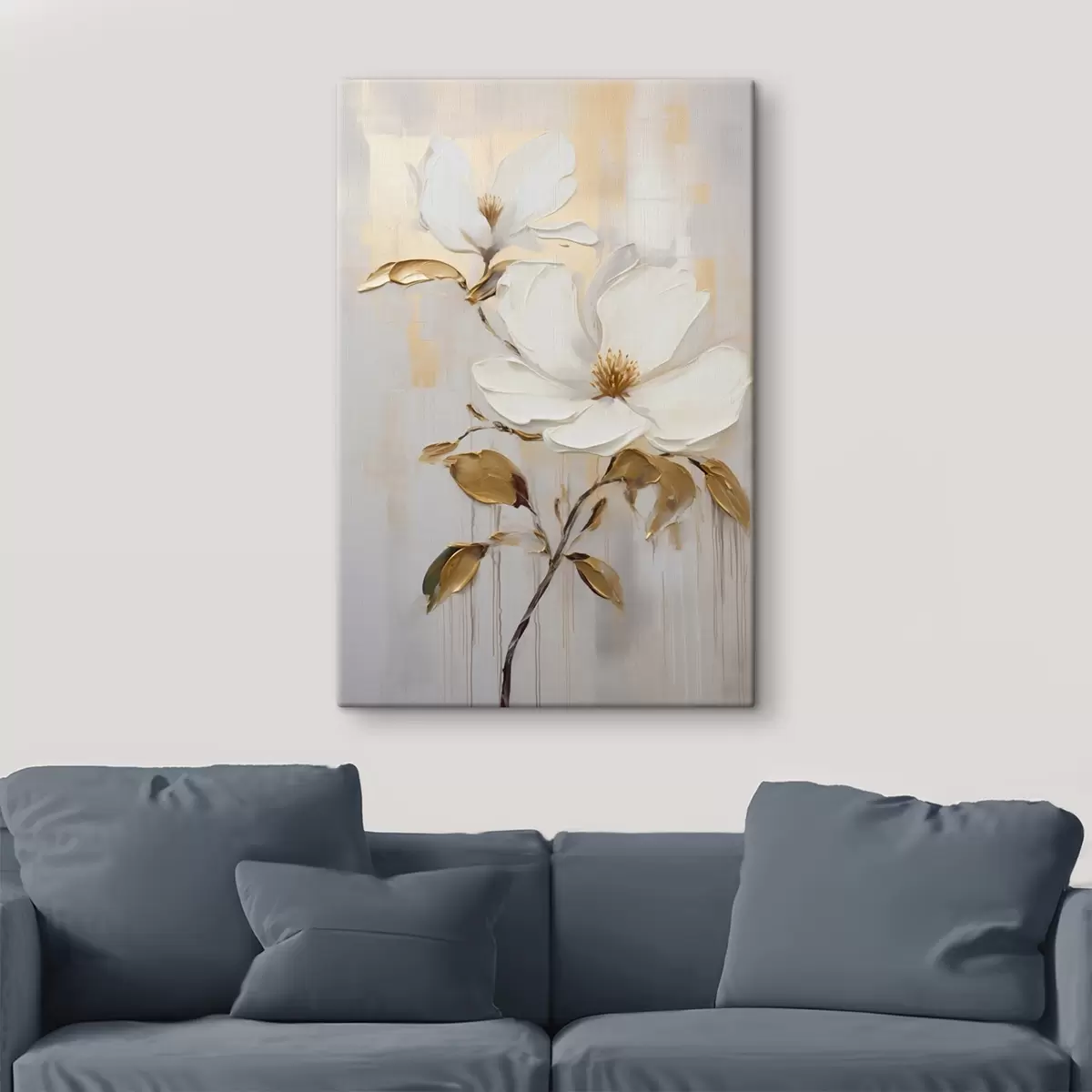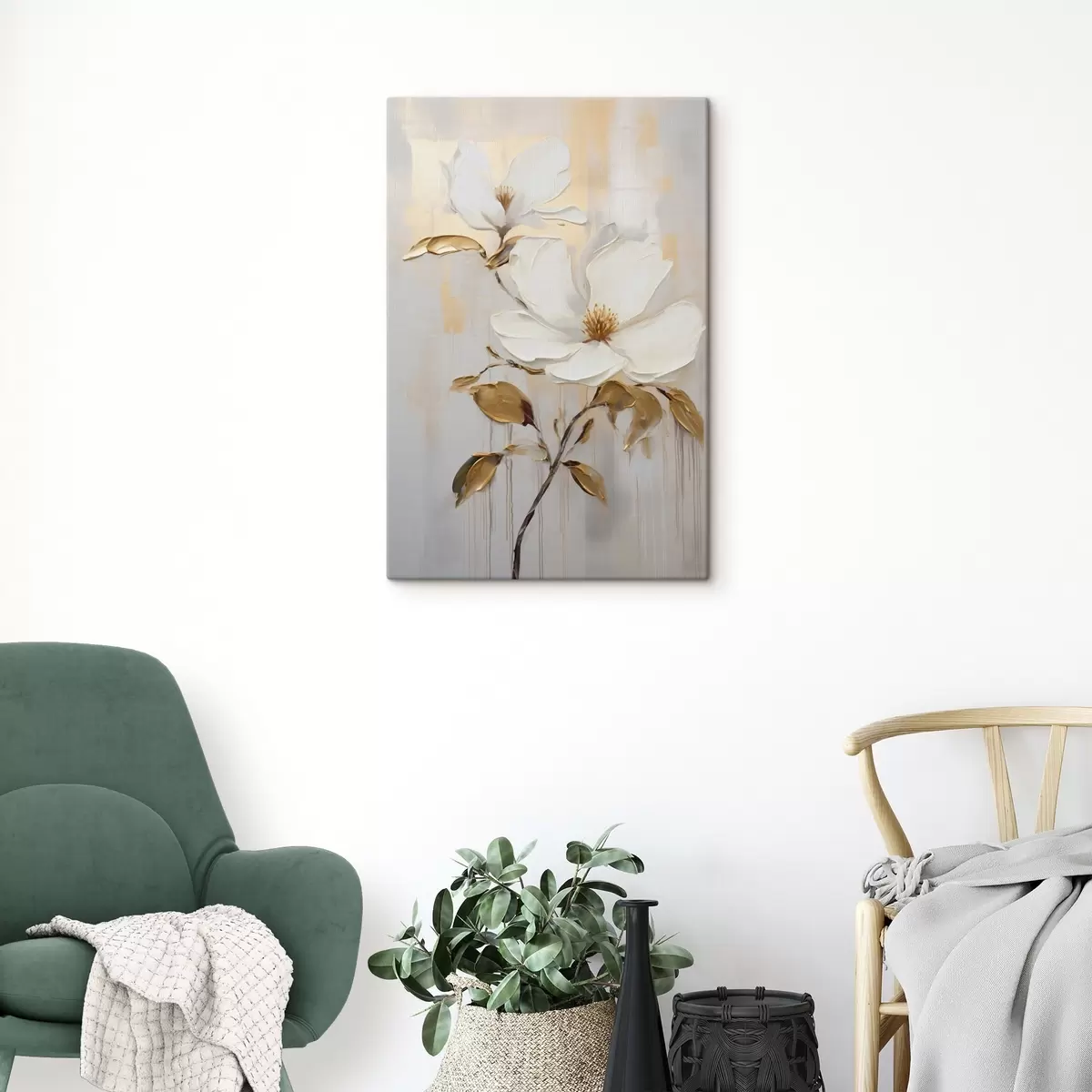Tableau Deux fleurs blanches avec des feuilles jaune-orange sur un fond clair Nr s45691