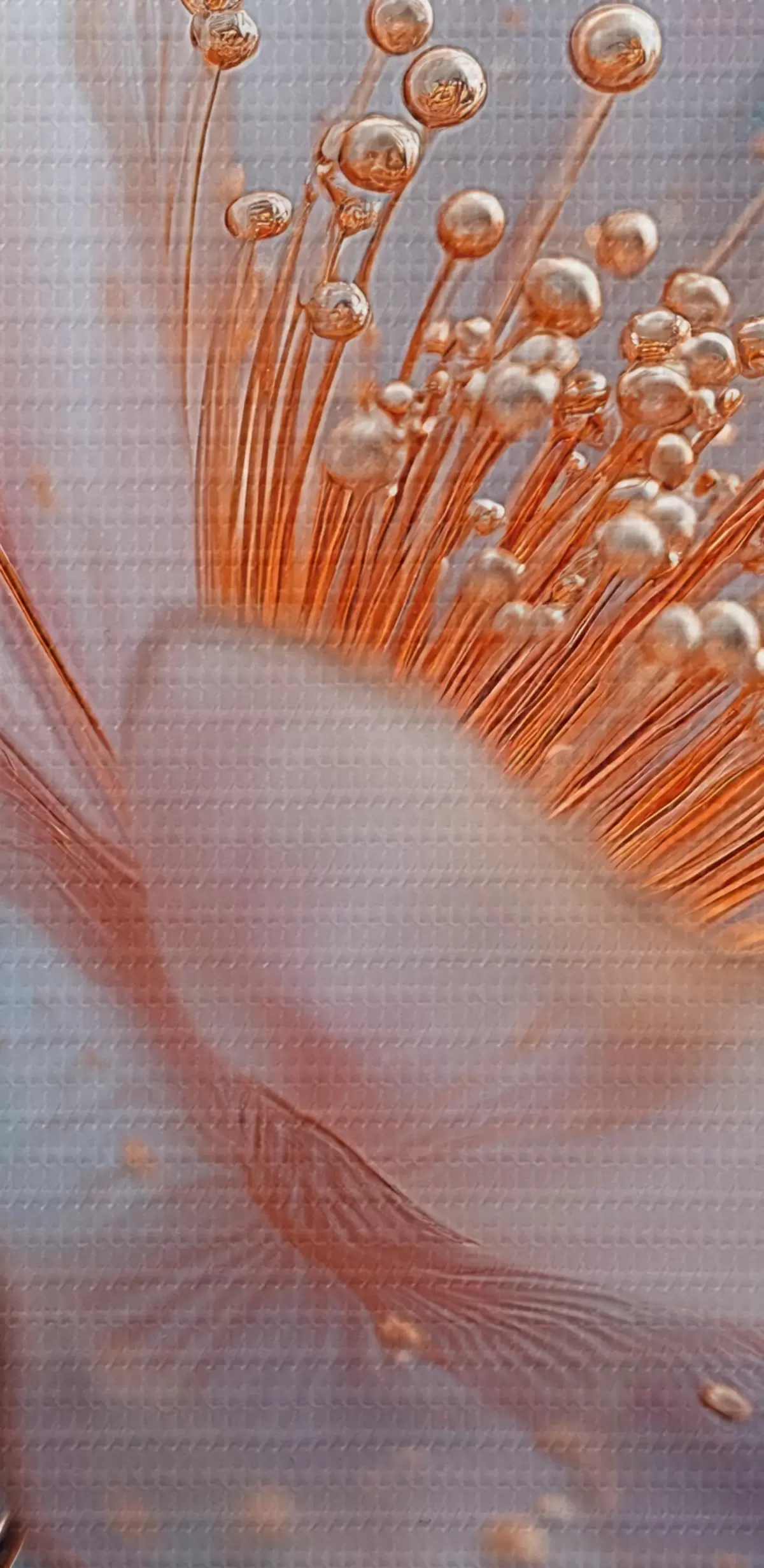 Tableau Fleur translucide avec des étamines cuivrées sur fond bleu s45880