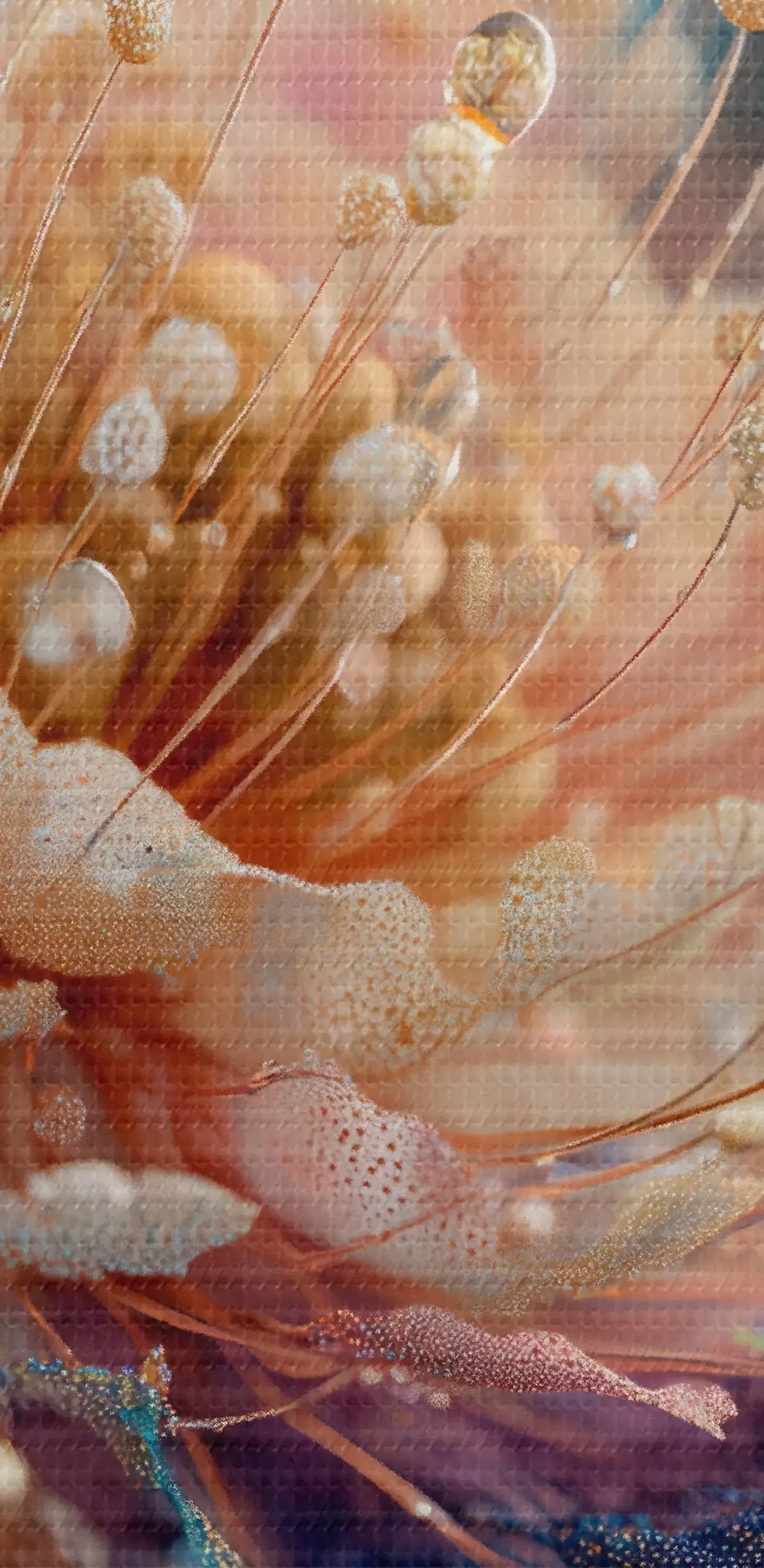 Tableau Fleur nacrée avec des gouttes de rosée, pétales couleur pêche et bleu Nr s45911
